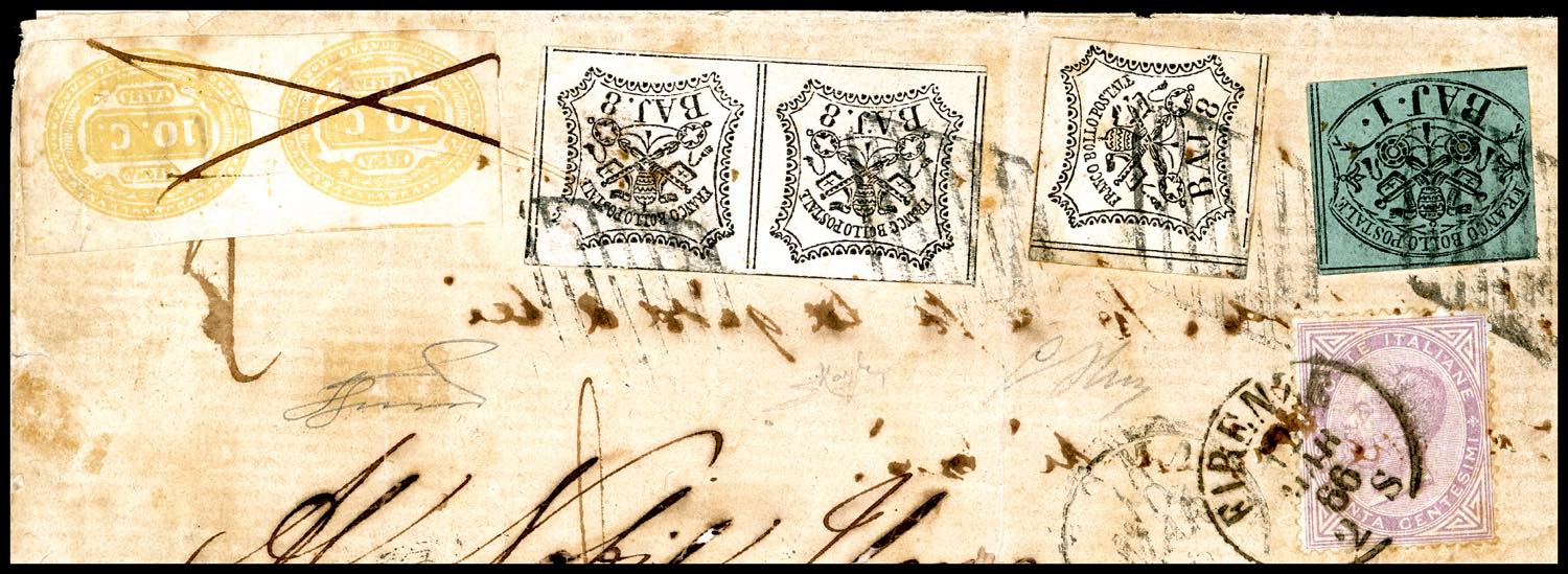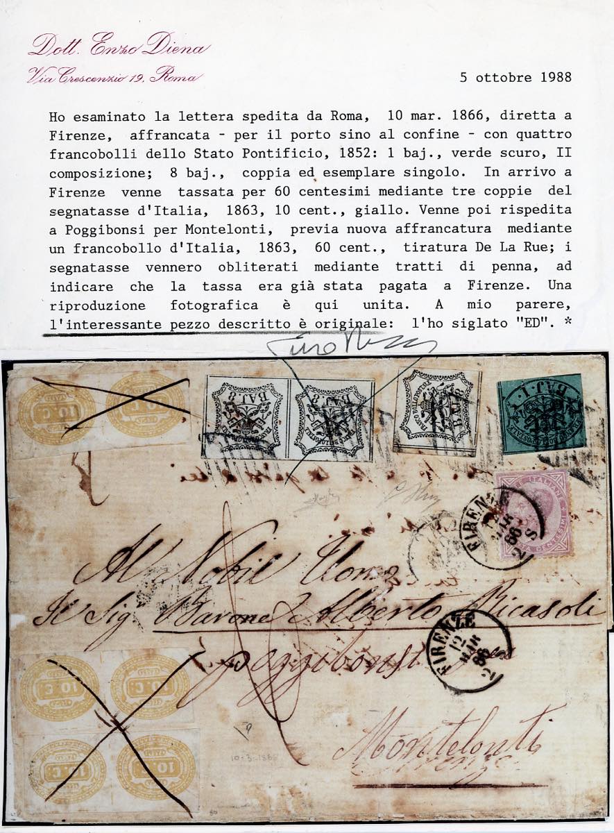 1866 - 1 baj verde scuro, II composizione, 8 baj bianco, singolo e coppia (Pontificio 2B,9), su lettera da Roma 10/3/1866 a Firenze, dove venne tassata 60 cent. con 10 cent. giallo segnatasse (Regno 1), tre coppie. Venne poi rispedita a Poggibonsi per Montelonti, previa nuova affrancatura con 60 cent. De La Rue, tiratura di Londra (Regno L21), annullato a Firenze 12/3/1866. I segnatasse vennero obliterati mediante tratti di penna, ad indicare che la tassa era già stata pagata a Firenze. ECCEZIONALE AFFRANCATURA MISTA DI RISPEDIZIONE, UNICA FINORA NOTA, CON FRANCOBOLLI PONTIFICI E, SIA FRANCOBOLLI CHE SEGNATASSE, ITALIANI. DA ESPOSIZIONE! G.Oliva, Raybaudi, cert. E.Diena, Ferrario, ex coll. Imperato.