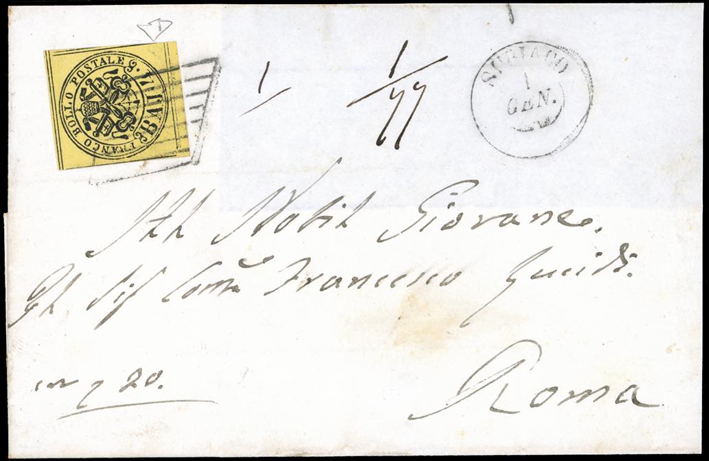 1864 - 4 baj giallo (5A), bordo di foglio in basso, perfetto e ben marginato, su fresco frontespizio di assicurata valore "con scudi 20" da Subiaco 1/1 a Roma. Raro e di ottima qualità. E.Diena. Ex coll. Imperato.