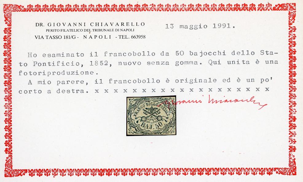 1852 - 50 baj azzurro (10), nuovo senza gomma, leggermente intaccato a destra. Cert. Chiavarello.