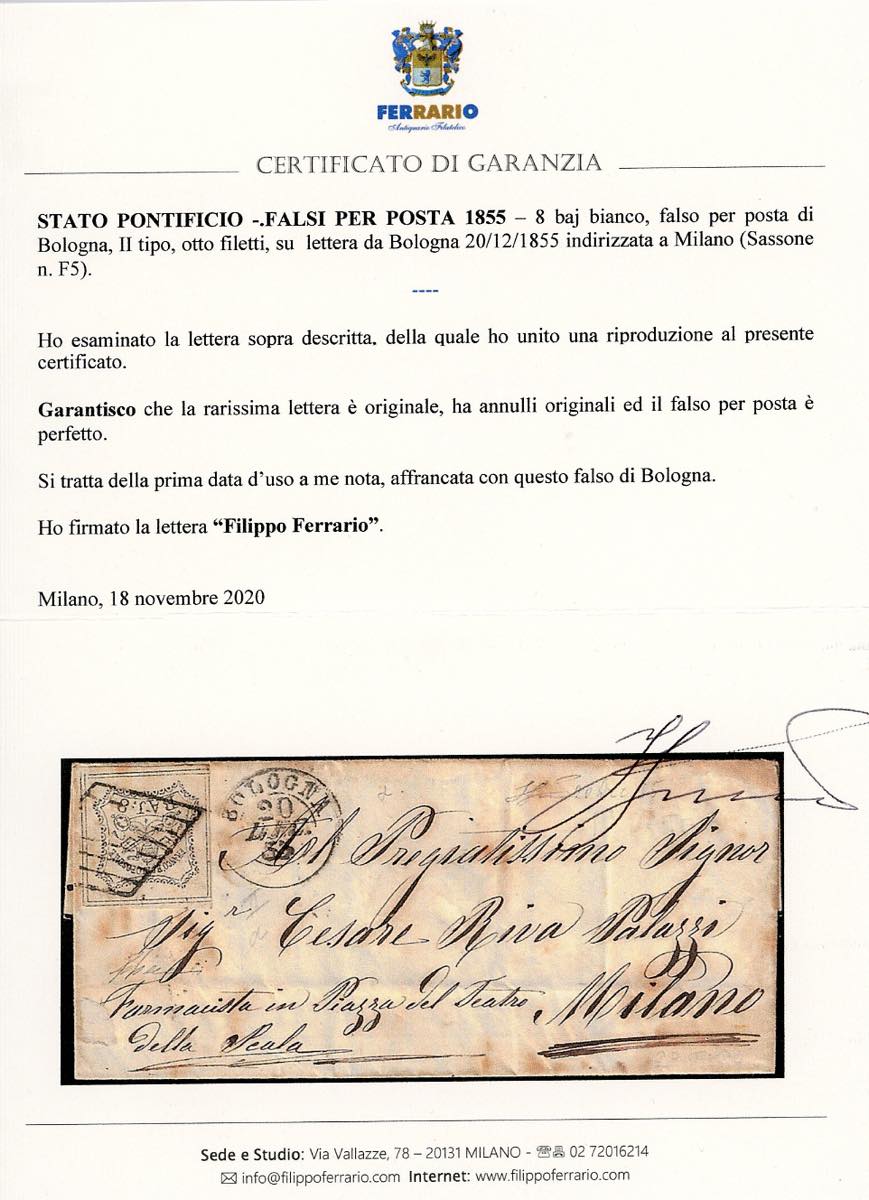 1855 - 8 baj bianco, falso per posta di Bologna, II tipo (F5), perfetto, otto filetti, su lettera da Bologna 20/12/1855 a Milano. Si tratta della PRIMA DATA D'USO NOTA di questo falso. Cert. Diena e Ferrario.