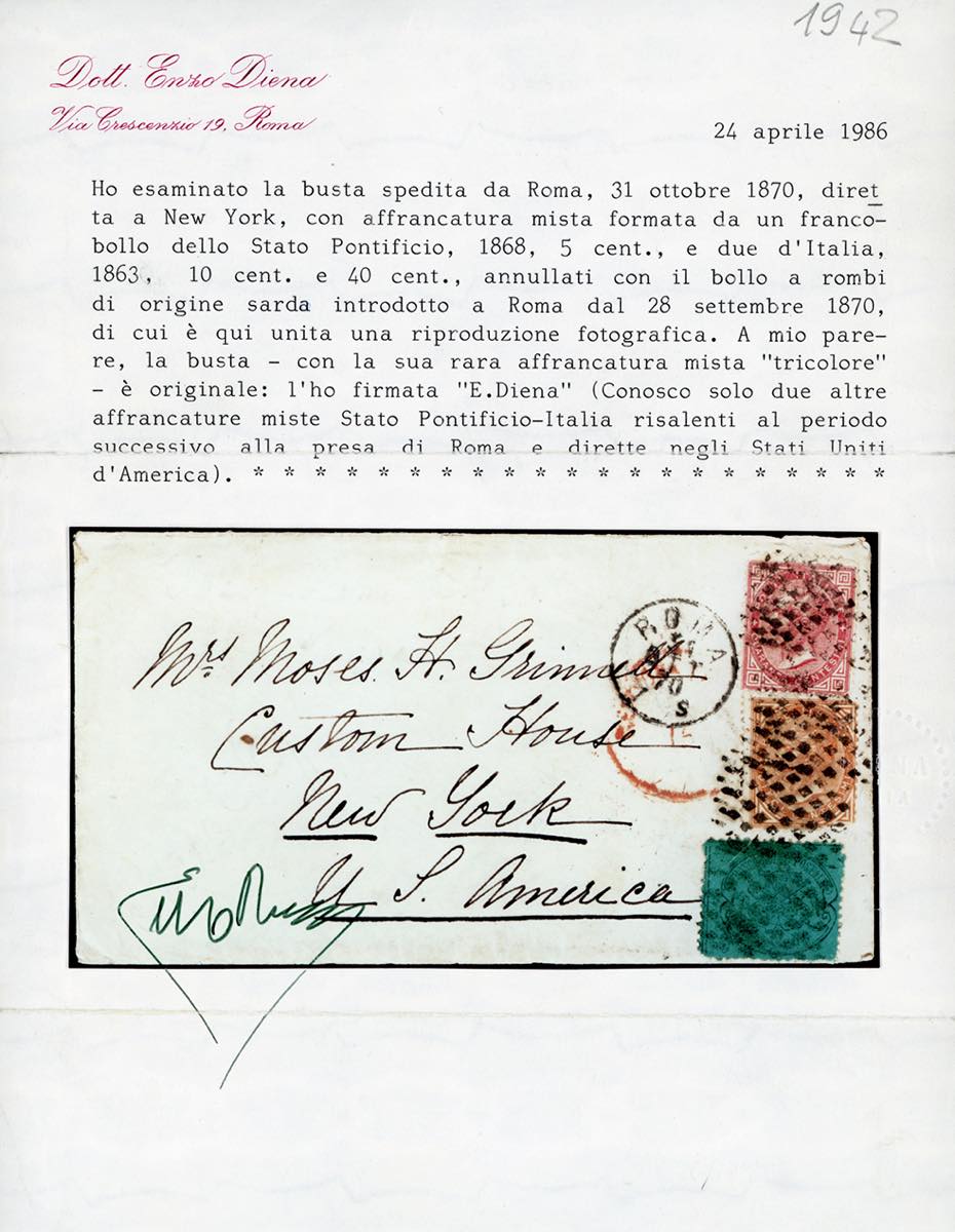 1870 - 5 cent. azzurro verdastro (25b), in affrancatura mista con 10 cent. e 40 cent. De La Rue, tiratura di Torino (T17,T20), su busta da Roma 31/10/1870 a New York, Stati Uniti d'America. Eccezionale e rarissima affrancatura mista, risalente all'ultimo giorno di vigore delle tariffe pontificie, ulteriormente impreziosita dalla destinazione oltre oceano. Cert. E.Diena