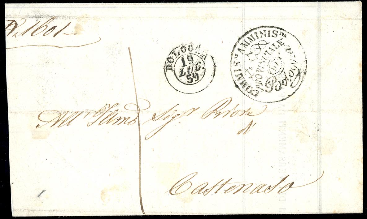 1859 - 3 baj bruno, frazionato verticalmente a 1/3 (4Aa), perfetto e ben marginato, al verso di lettera in porto assegnato da Bologna 19/7/1859 a Castenaso, tassa 1 baj sul fronte. Cert. Ferrario.