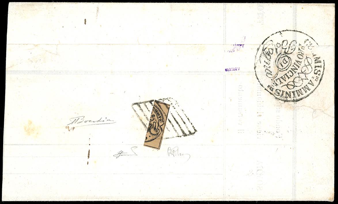1859 - 3 baj bruno, frazionato verticalmente a 1/3 (4Aa), perfetto e ben marginato, al verso di lettera in porto assegnato da Bologna ... Leggi tutto