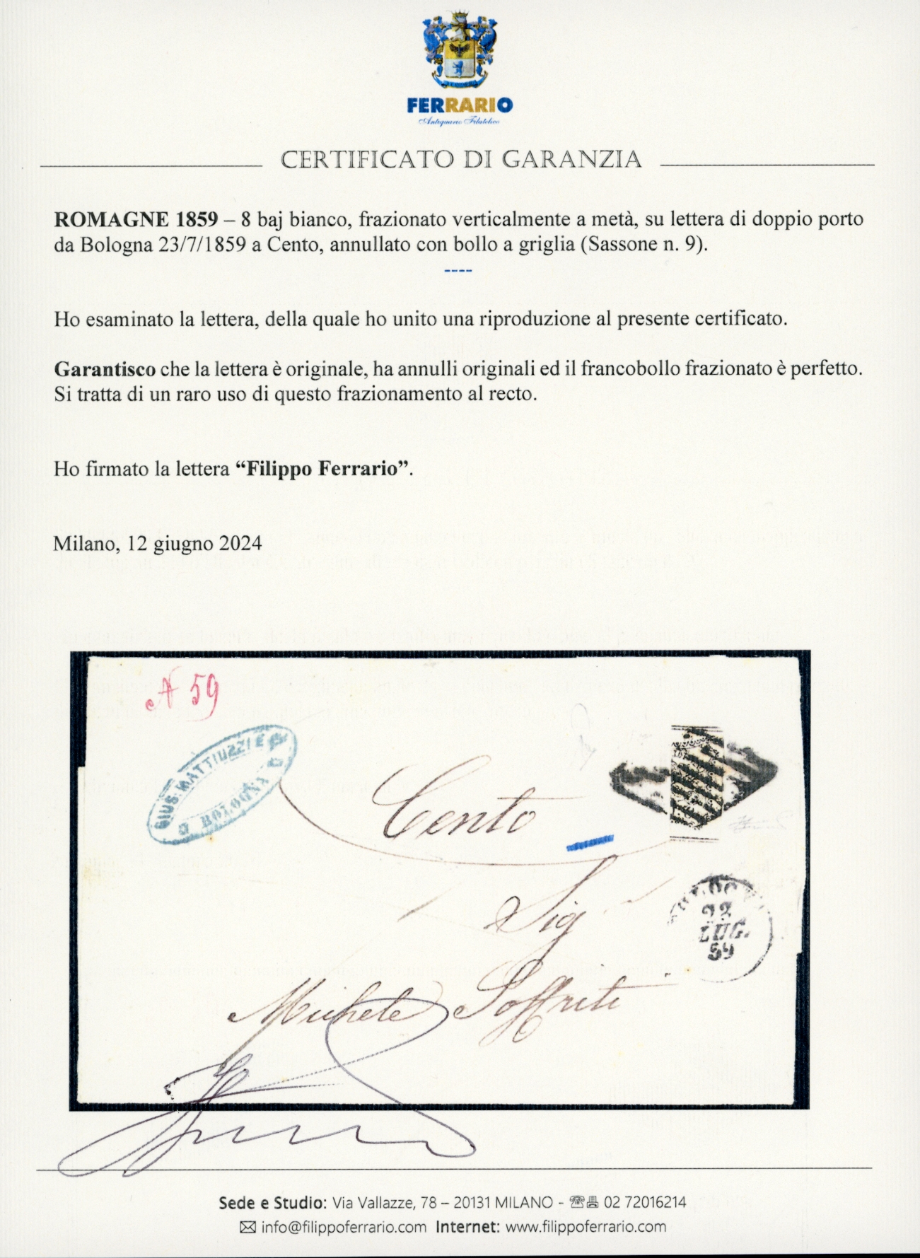 1859 - 8 baj bianco, frazionato verticalmente a metà (9), su lettera di doppio porto da Bologna 23/7/1859 a Cento. Raro uso di questo francobollo frazionato al recto, catalogato solo con frazionamento orizzontale. A.Diena, cert. Ferrario.