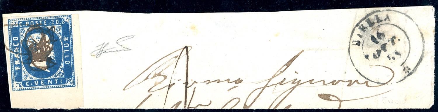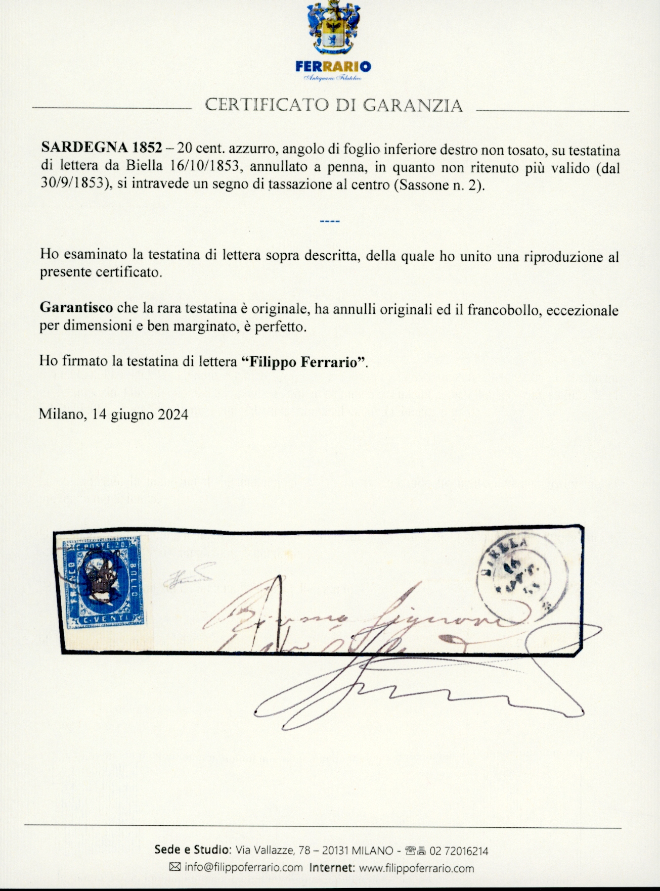 1853 - 20 cent. azzurro (2), ben marginato, angolo di foglio inferiore destro non tosato, perfetto, su testatina di lettera da Biella 16/10/1853. Il francobollo, eccezionale per dimensioni, fu annullato a penna, in quanto non ritenuto più valido (dal 30/9/1853), infatti si intravede al centro un segno di tassazione. Insieme molto bello e probabilemente unico nel suo genere. Cert. Ferrario.