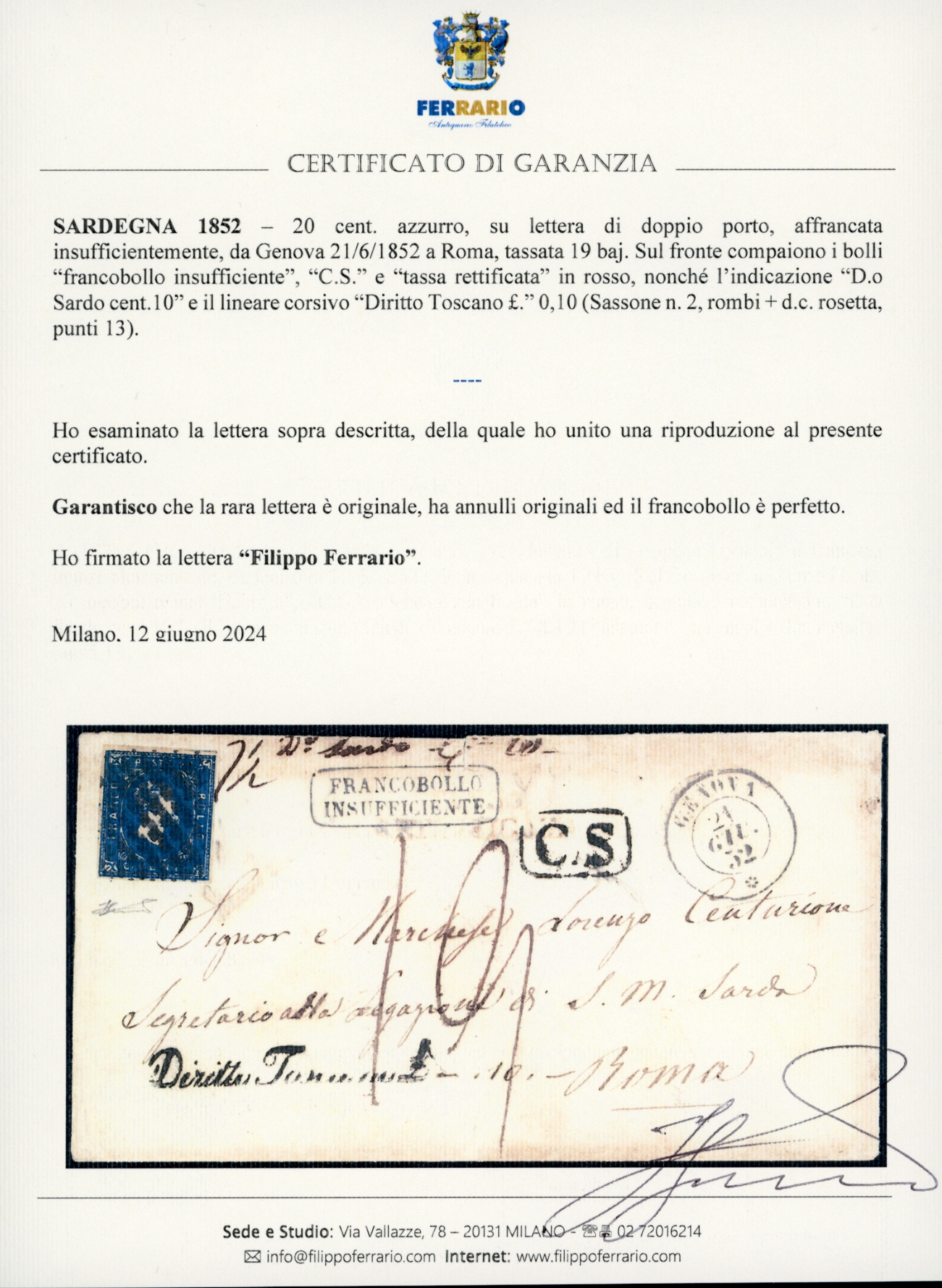 1852 - 20 cent. azzurro (2), perfetto, su lettera di doppio porto affrancata insufficientemente da Genova 21/6/1852 (rombi+d.c.rosetta,punti 13) a Roma, dove venne tassata 19 baj. Sul fronte compaiono i bolli "francobollo insufficiente","C.S." e "tassa rettificata" in rosso, nonché l'indicazione "D.o Sardo cent. 10" e il lineare corsivo "Diritto Toscano £" 01,0. Molto rara e di grande interesse storico postale, per specialista. Cert. Ferrario.