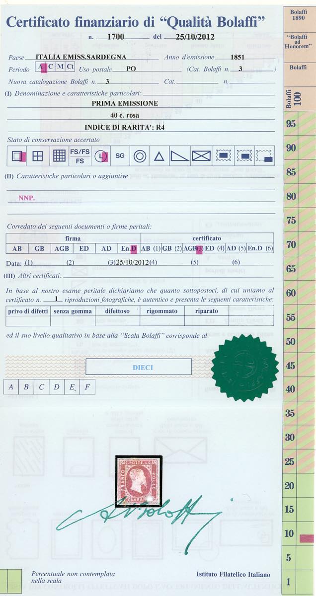 1851 - 40 cent. rosa (3), ottimi margini, gomma originale, lievi grinze di gomma. Aspetto eccezionale, occasione! E.Diena, cert. Finanziario Bolaffi.