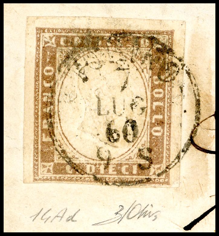 1860 - 10 cent. bruno chiaro rosaceo, seppia (14Ad), perfetto, isolato su busta in tariffa ridotta per militari da Torino 7/7/1860 a ... Leggi tutto