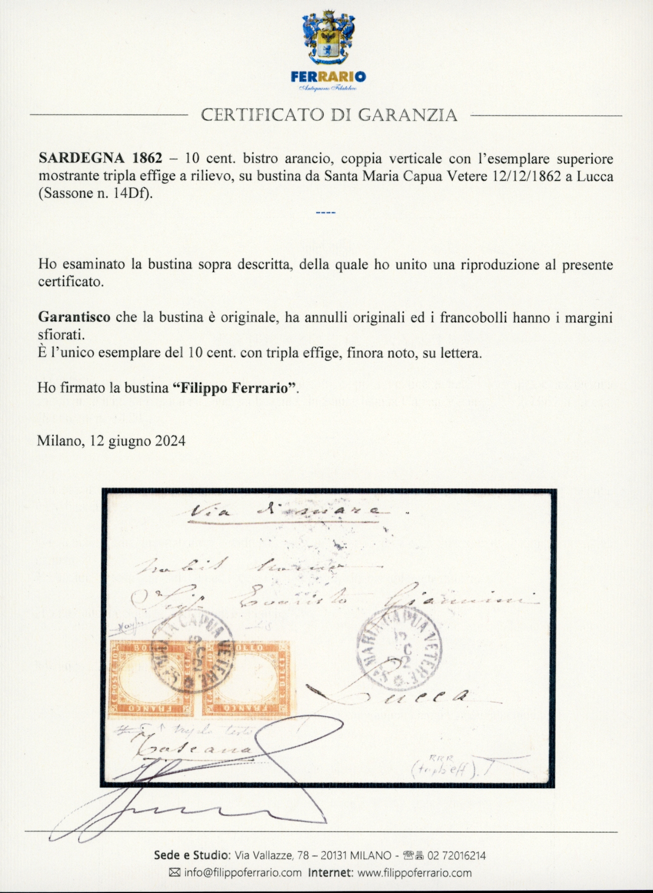 1862 - 10 cent. bistro arancio, coppia verticale con l'esemplare superiore mostrante TRIPLA EFFIGIE A RILIEVO (14df), margini sfiorati, su bustina da Santa Maria Capua Vetere 12/12/1862 a Lucca. Insieme molto raro e in ottimo stato di conservazione. Il Sassone non cataloga esemplari con tale evidente varietà su corrispondenza. Rarità della IV emissione di Sardegna. Fiecchi, cert. Bottacchi, Ferrario, Raybaudi.