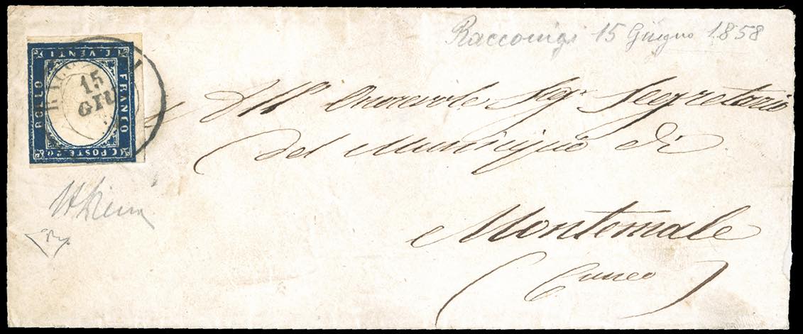 1858 - 20 cent. indaco, EFFIGE CAPOVOLTA (15Ab), perfetto, su busta da Racconigi 15/6/1858 a Montemale, in provincia di Cuneo. Rara. Cert. ... Leggi tutto