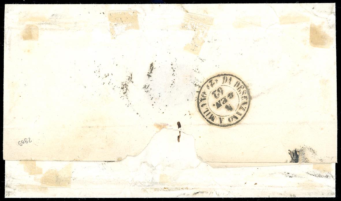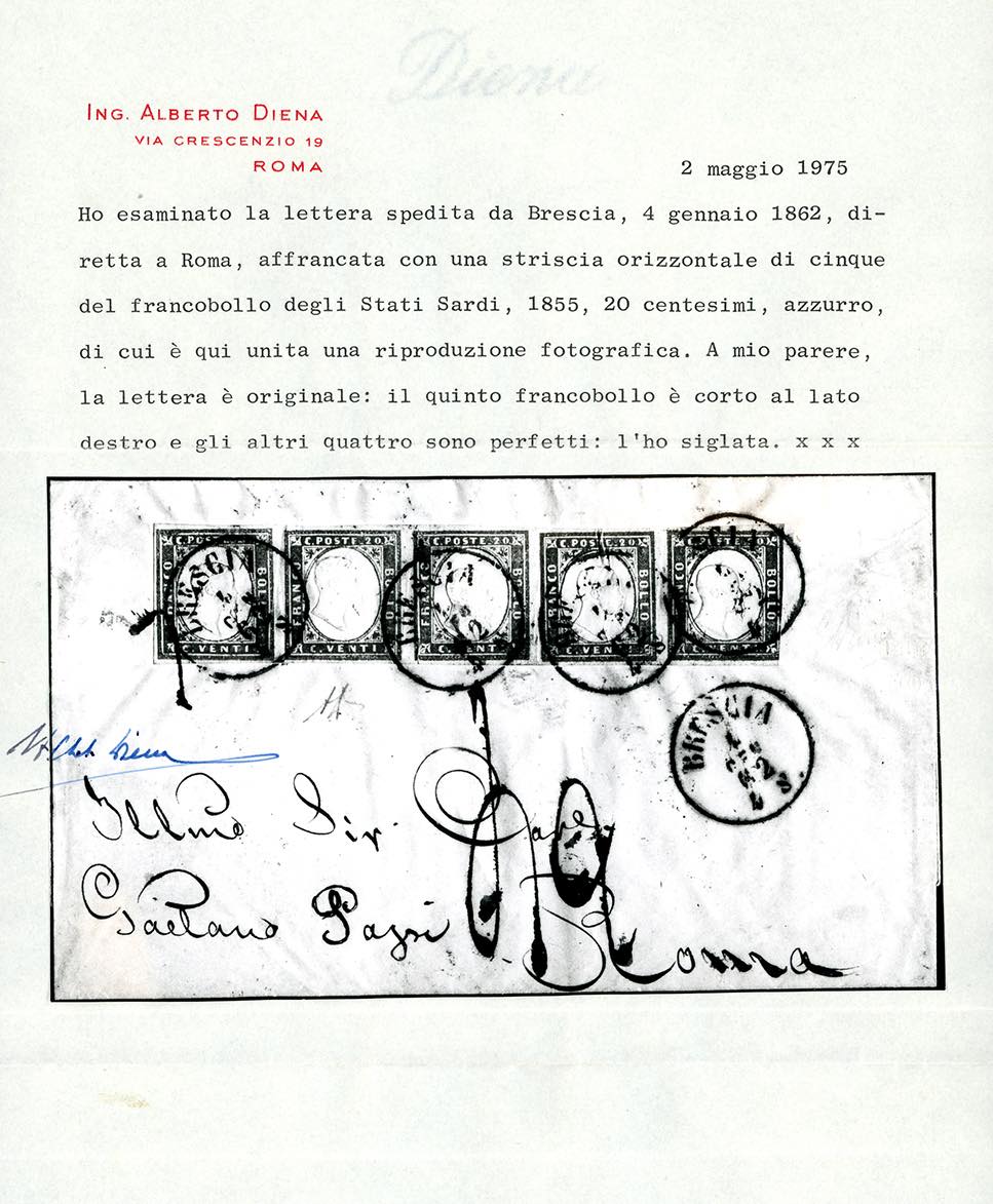 1862 - 20 cent. azzurro (15Ca), striscia orizzontale di cinque con ampi margini, appena sfiorato l'ultimo esemplare, su fresca lettera da Brescia 4/1/1862 a Roma, tassata 42 baiocchi. Affrancatura multipla monovalore d'effetto e rara. Emilio Diena, Chiavarello, Ferrario e cert. A.Diena. Ex coll. Imperato.