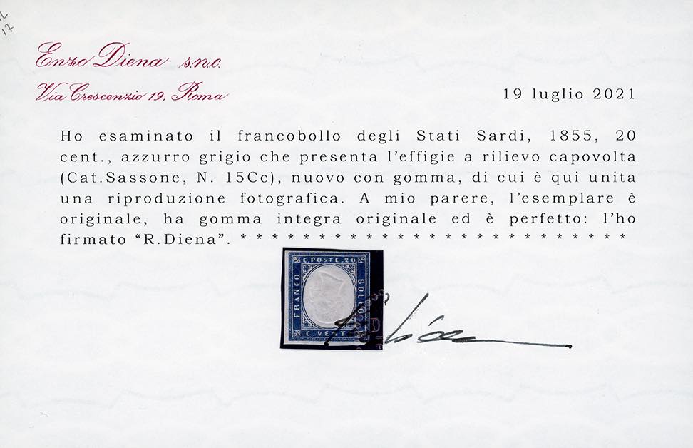 1860 - 20 cent. azzurro grigio, effigie capovolta (15Cc), gomma originale integra, perfetto. Molto fresco. A.Diena, Raybaudi, cert. Diena.