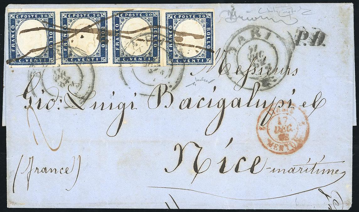 1862 - 20 cent. indaco (15E), striscia di tre, giusta a sinistra, e singolo, perfetto, su lettera di doppio porto da Bari 11/12/1862, francobolli annullati anche a penna, per Nizza Marittima. Annullamento raro e non censito. Grioni, Raybaudi, Chiavarello. Ex coll. Imperato.