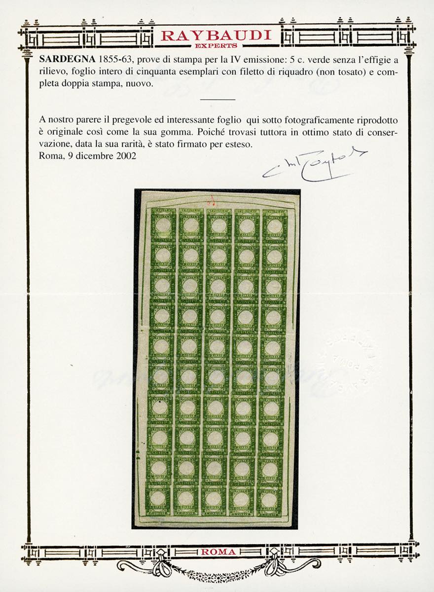 1863 - 5 cent. verde (13Ea), senza effigie, foglio completo di 50 esemplari con filetto di riquadro, margini non tosati, e doppia stampa completa, piega orizzontale che interessa cinque francobolli. Raro! Cert. Oro Raybaudi.
