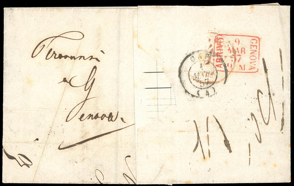 1857 - Lettera non affrancata da Marsiglia 29/2/1857 a Firenze, rispedita a Genova dove venne applicato il segnatasse mod. 200 bis, con l'indicazione dei diritti esteri e della tassa interna. Raro uso di questo segnatasse a Genova. Chiavarello, Ferrario. Ex coll. Imperato.
