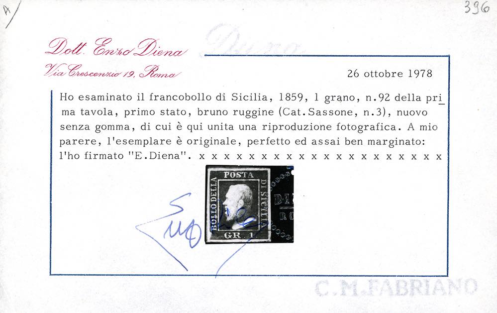 1859 - 1 grano bruno ruggine, I tavola, I stato, posiz. 92, testa d'avorio (3), nuovo senza gomma, perfetto. Splendido e raro, margini enormi. Emilio Diena, cert. Enzo Diena. Ex coll. Imperato.