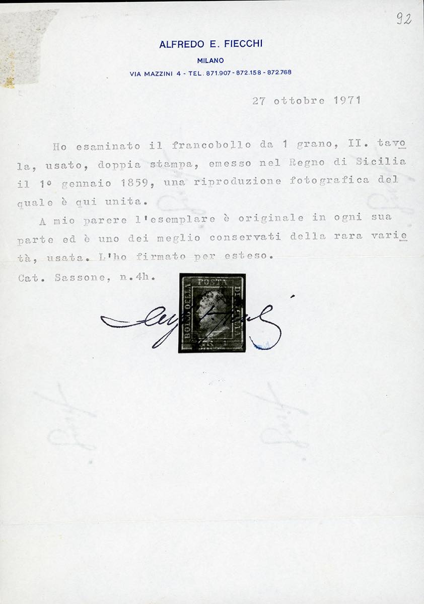 1859 - 1 grano bruno oliva, II tavola, DOPPIA STAMPA VERTICALE (4h), usato, perfetto. Molto bello e raro, pochi esistenti. Emilio Diena, cert. Fiecchi ed Enzo Diena. Ex coll. Imperato.