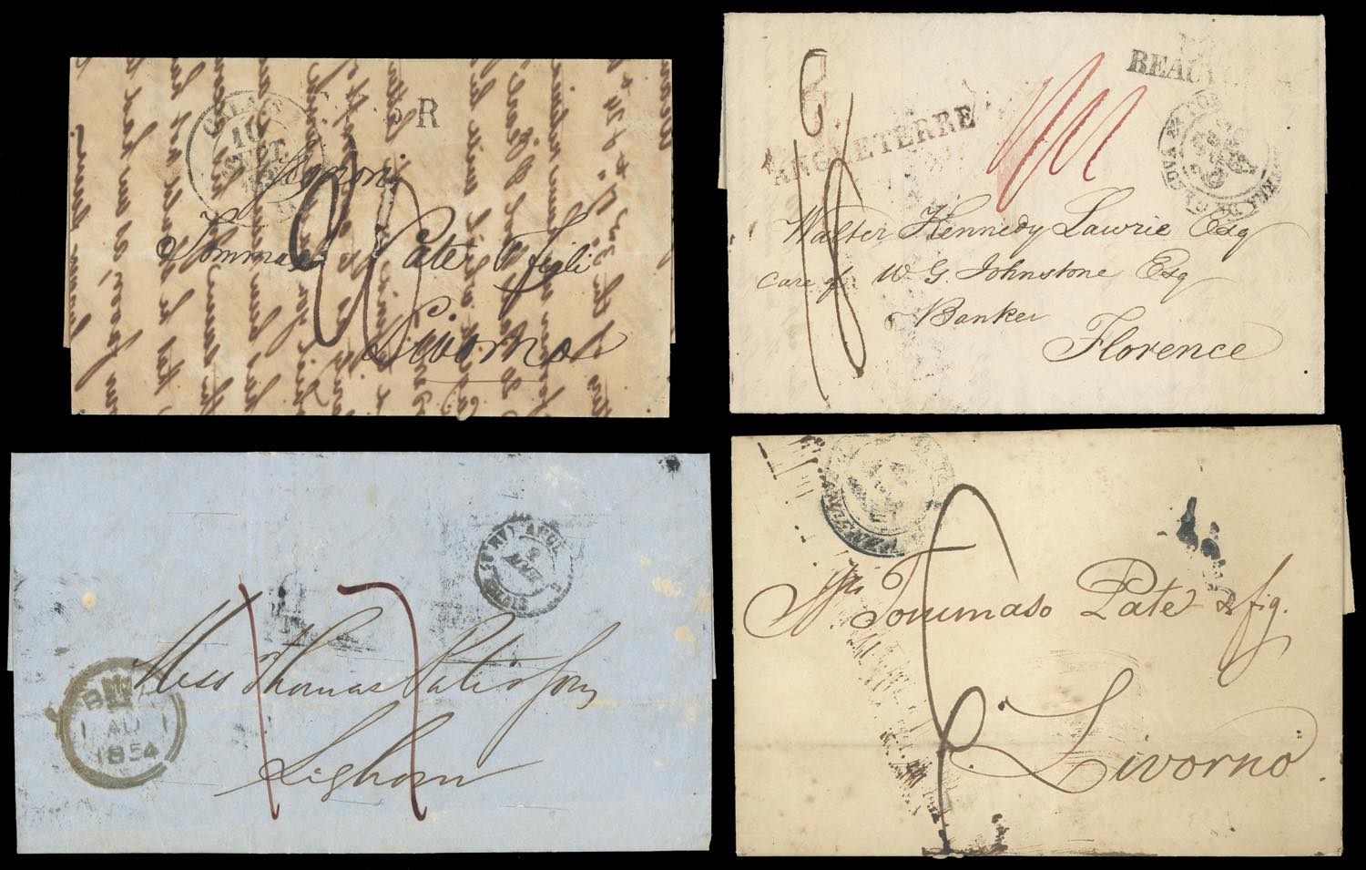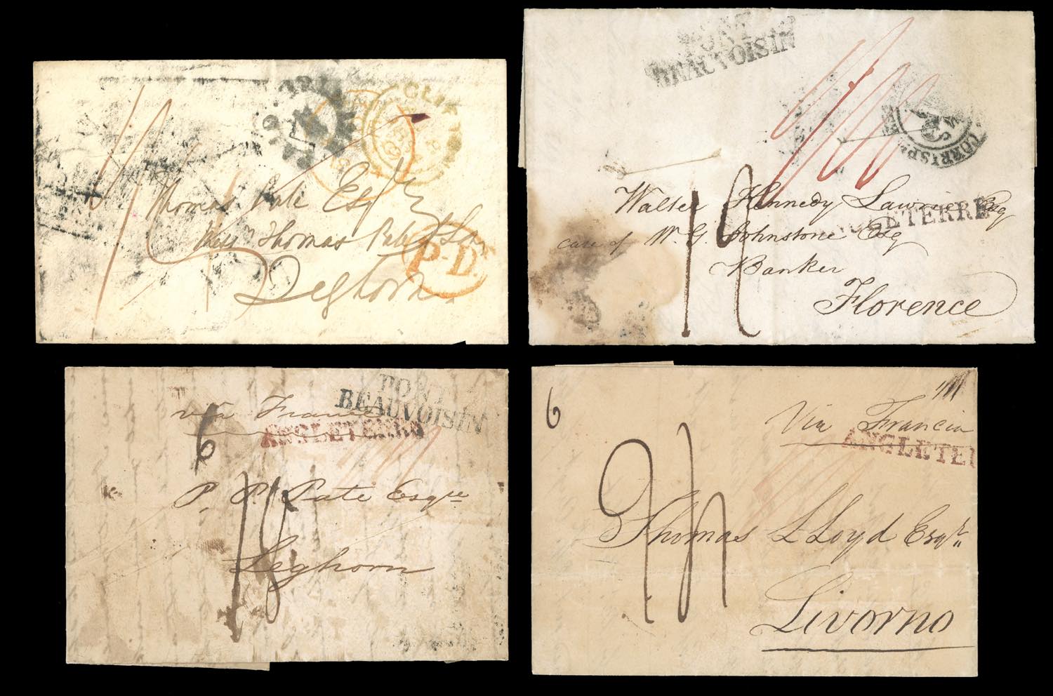 INCOMING MAIL 1832/1854 - Bell'insieme di otto lettere non affrancate dall'Inghilterra al Granducato di Toscana, tutte con tagli o bolli di disinfezione. Diversi bolli di transito e tassazioni, alcune instradate a mezzo forwarder. Interessanti.