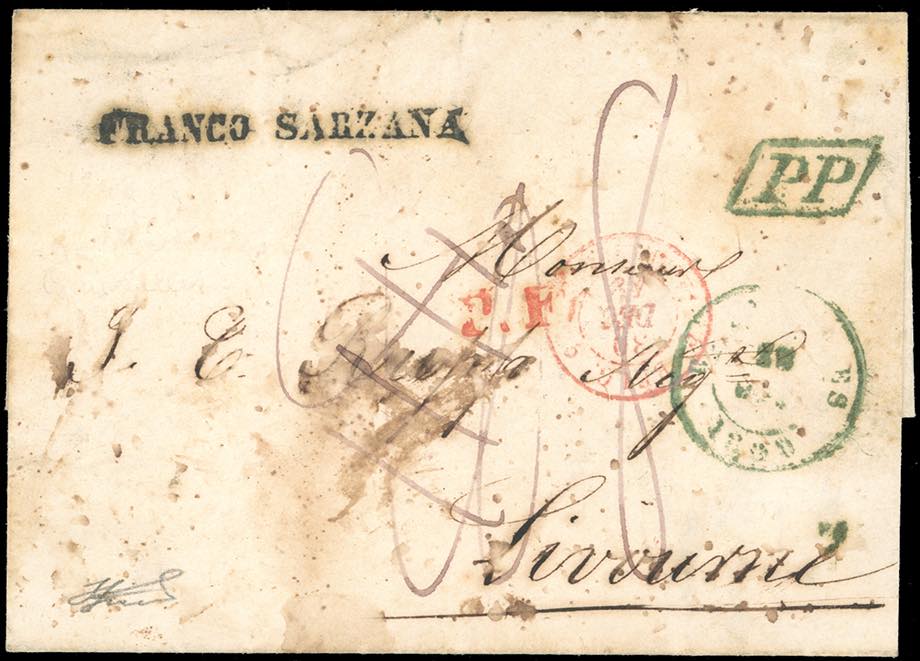INCOMING MAIL BELGIO 1850 - Lettera non affrancata da Bruxelles 28/12/1850 a Livorono, sul fronte il lineare "franco Sarzana" e tassazioni cassate e corrette. Interessante e non comune. Ferrario.