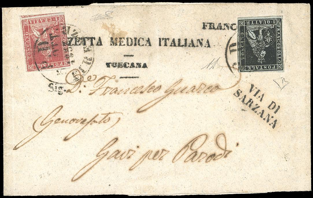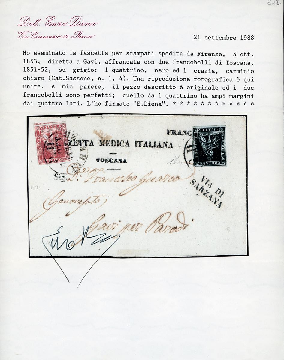 1853 - 1 quattrino nero su grigio, perfetto e ben marginato, 1 crazia carminio su grigio, giusto a sinistra (1,4d), su fascetta per stampati da Firenze 5/10/1853 a Gavi, lineare su due righe "via di Sarzana". Rarissimo porto multiplo per stampati per il Regno di Sardegna. UNA DELLE CINQUE AFFRANCATURE COSI' FORMATE NOTE, di ottima qualità. A.Diena, Ferrario, cert. E.Diena. Ex coll. Imperato.