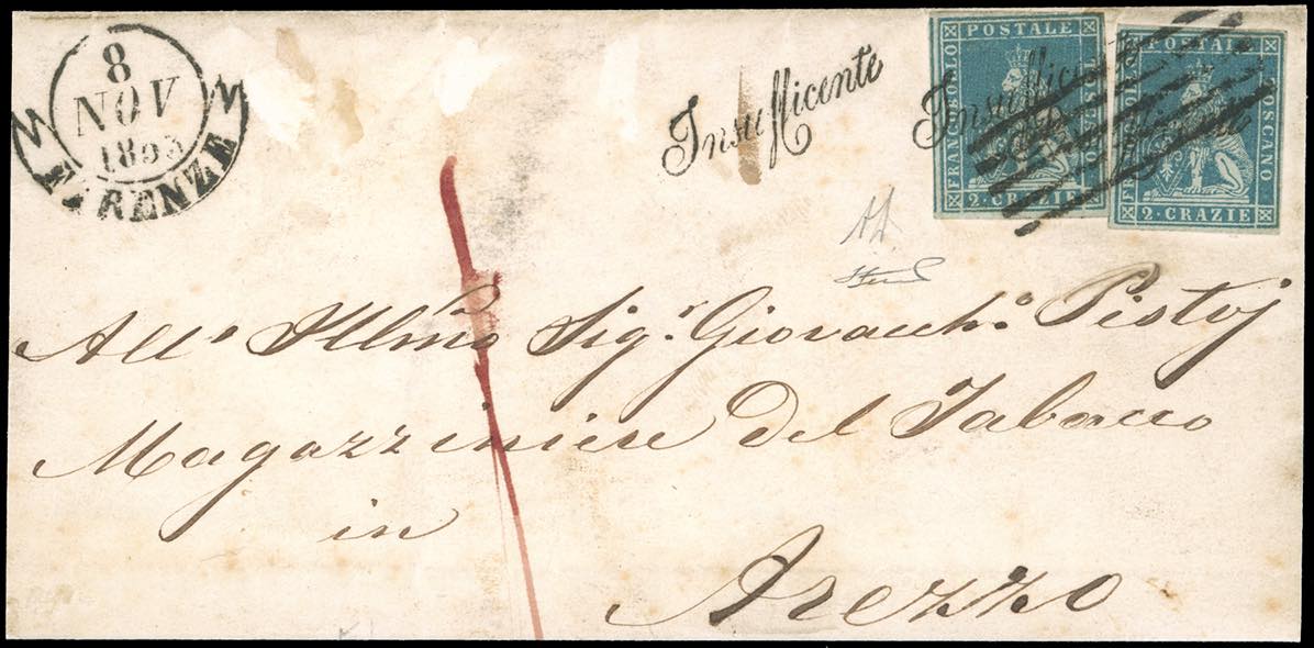 1853 - 2 crazie azzurro su grigio (5), due esemplari, perfetti, su lettera da Firenze 8/11/1853 ad Arezzo, tassata. I due francobolli sono annullati del bollo a 5 sbarre ed il corsivo "Insufficiente". Molto bella e interessante. A.Diena, Ferrario.
