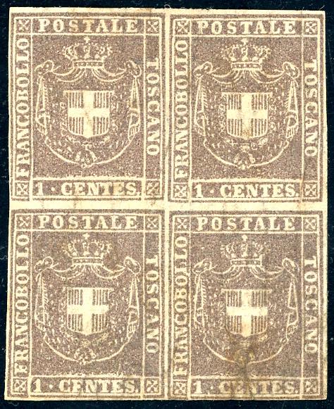 1860 - 1 cent. violetto bruno (17), eccezionale blocco di quattro, nuovo, gomma originale, ben marginato. Due esemplari perfetti e due con impercettibili difetti. Rarità. Cert. Ferrario. Ex coll. Imperato.