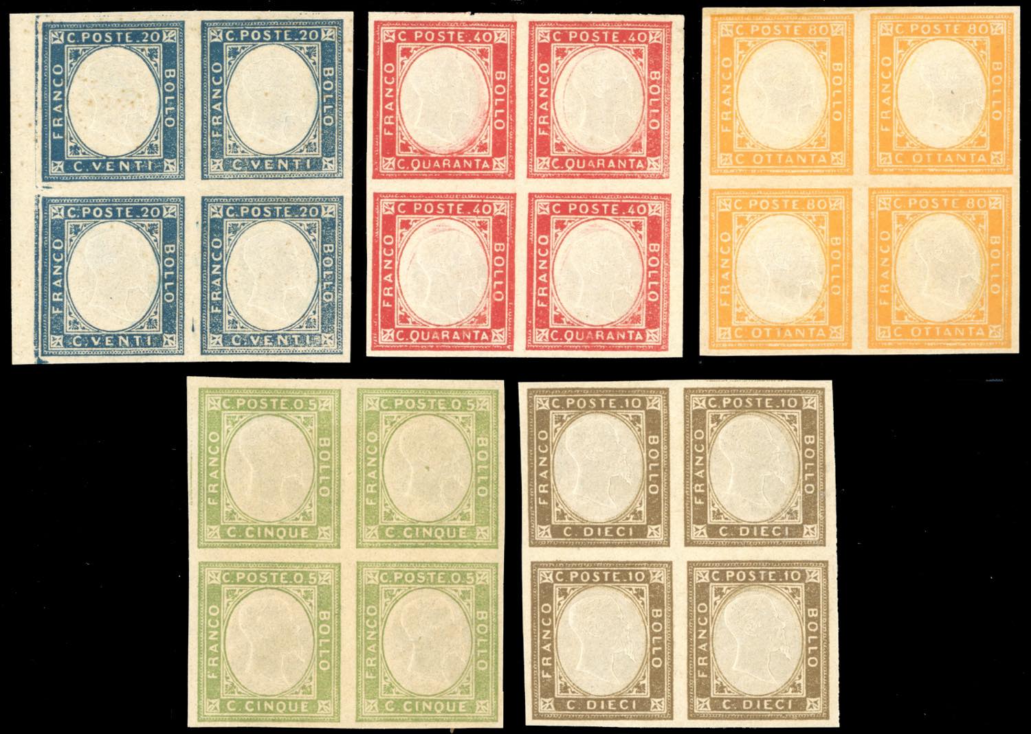 1861 - Non emessi per le Province Napoletane, serie completa (1/5), blocchi di quattro, nuovi, gomma originale integra, perfetti. Ottima ... Leggi tutto