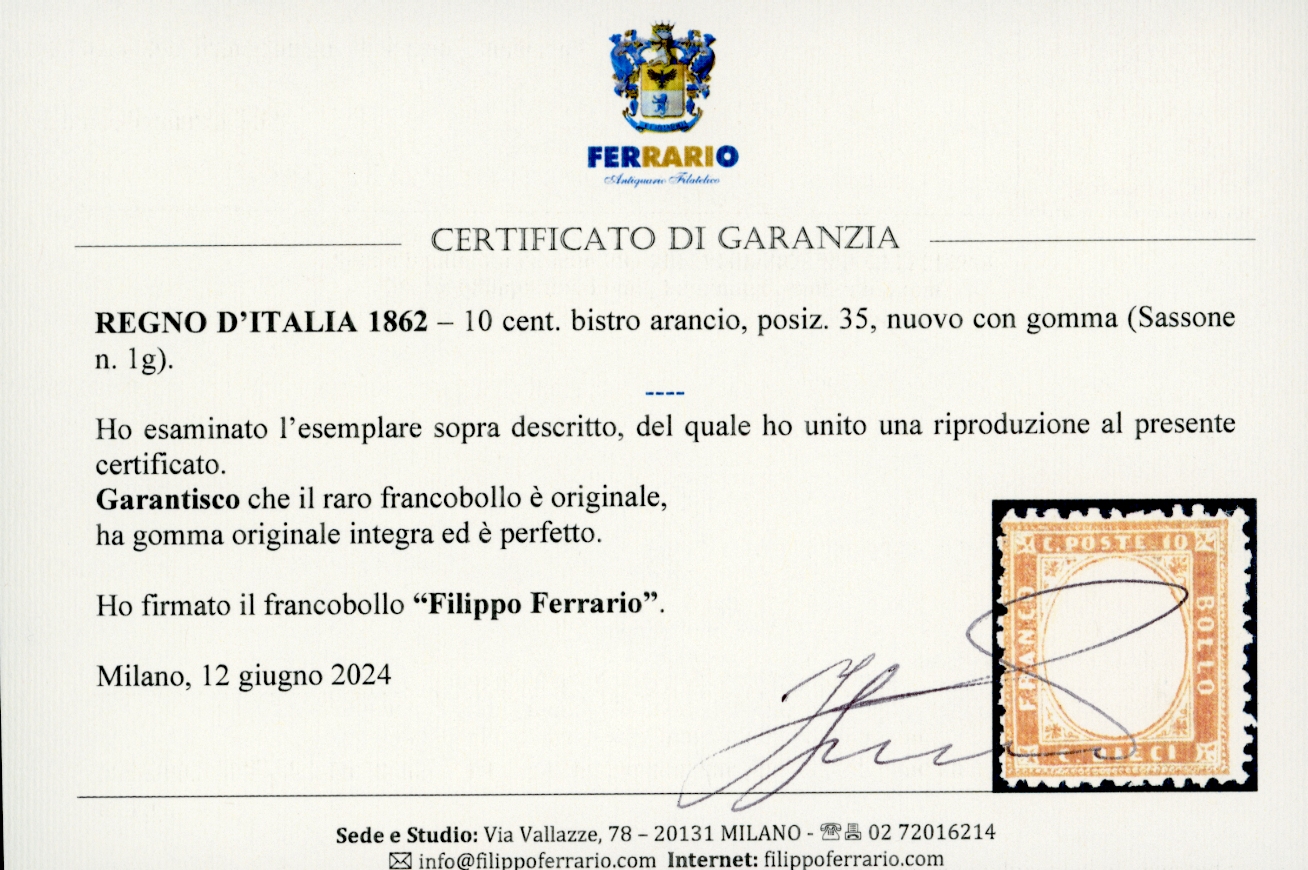 1862 - 10 cent. bistro arancio, pos. 35 (1g), gomma originale integra, perfetto e molto fresco. Cert. A.Diena, Sorani, Ferrario.