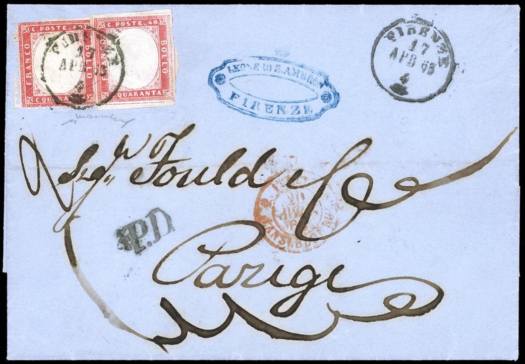 1863 - 40 cent. rosso carminio (3), separato con le forbici, in affrancatura mista con 40 cent. rosa carminio IV emissione di Sardegna, filetto di inquadratura completo sui quattro lati pos. 12 (16E), perfetto, su fresca lettera di doppio porto da Firenze 17/4/1863 a Parigi. Delle pochissime affrancature analoghe di valori gemelli, questa è l'unica con un francobollo con il filetto di inquadratura completa. Rarità dell'emissione Matraire, di ottimo aspetto. Cert. Chiavarello. Ex coll. Imperato.