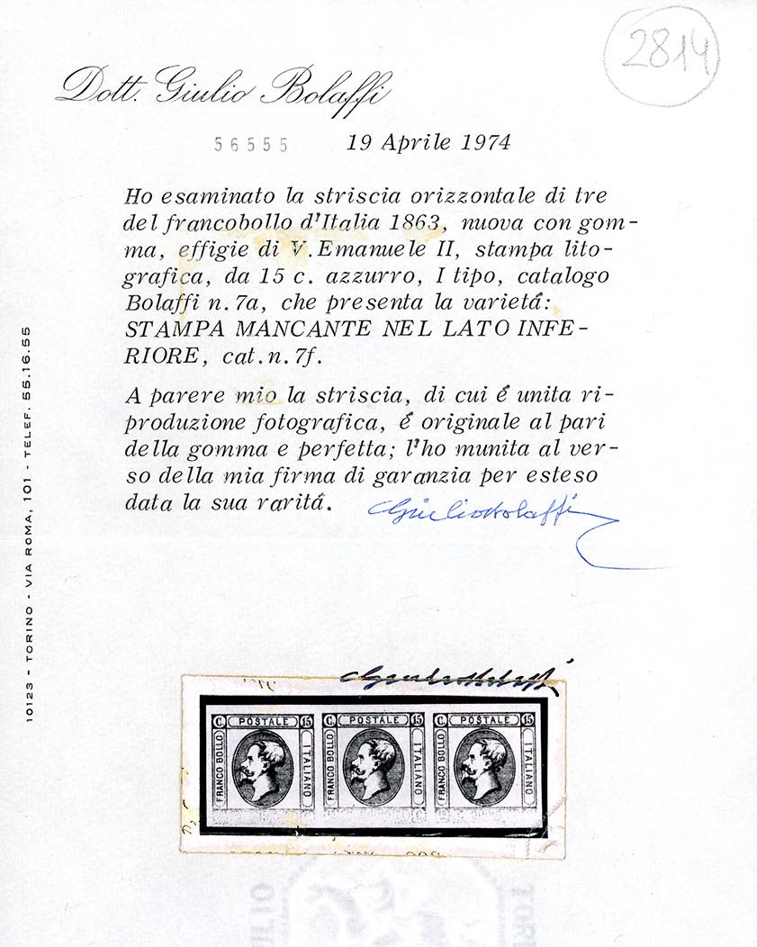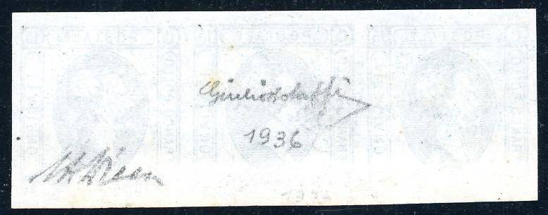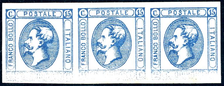 1863 - 15 cent. azzurro, I tipo, striscia orizzontale di tre senza il tassello inferiore (12e), nuova, gomma originale integra, perfetta. Splendida varietà, INSIEME UNICO. Alberto Diena per esteso e cert. G.Bolaffi.