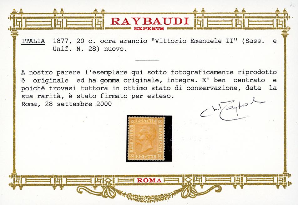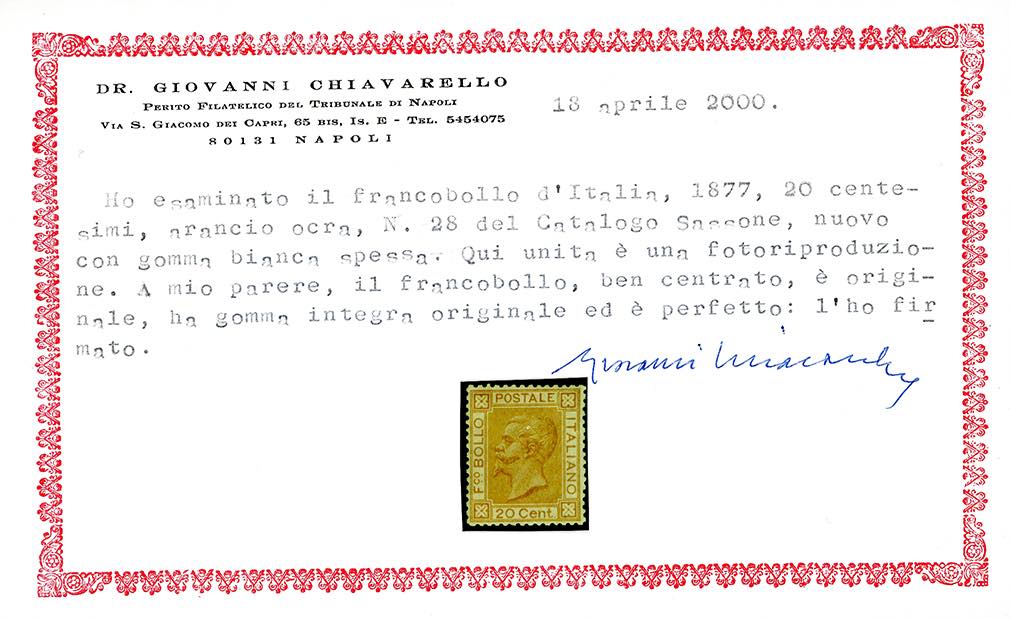 1877 - 20 cent. ocra arancio (28), nuovo, gomma originale integra, perfetto e ben centrato. Cert. Chiavarello e Oro Raybaudi.