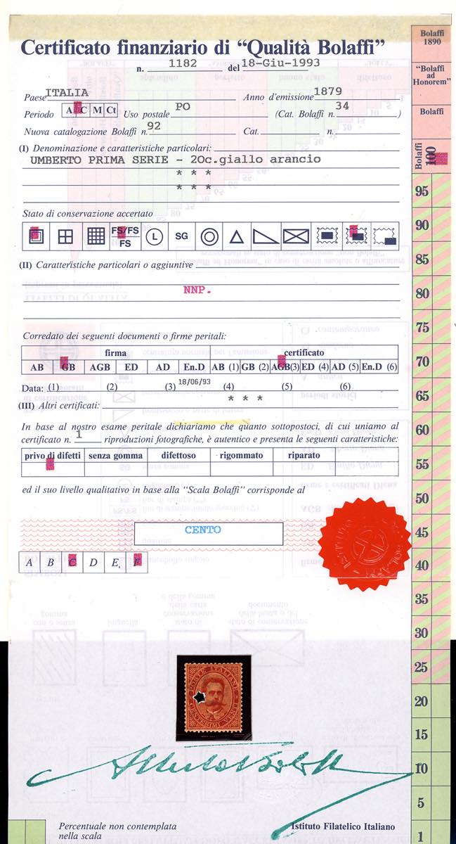 1879 - 20 cent. Umberto I (39), nuovo, gomma originale integra, perfetto. Splendido per freschezza e centratura. G.Bolaffi, G.Oliva, Raybaudi, cert. Finanziario Bolaffi 100%.
