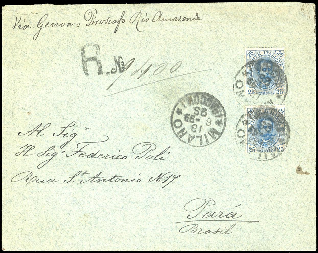 1899 - 25 cent. Umberto I (62), due esemplari, perfetti, su busta raccomandata da Milano 1376/1899 a Parà, in Brasile, manoscritto "Via Genova-Piroscafo Rio Amazzonia". Non comune.