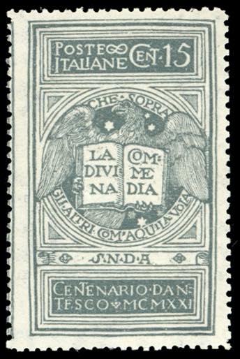 1921 - 15 cent. grigio Dante, non emesso (116A), centratura eccezionale e formato maggiore a causa del salto del perforatore, gomma ... Leggi tutto
