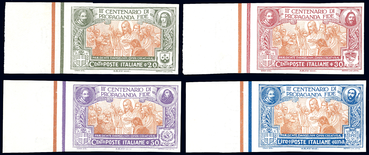 1923 - Propaganda Fide, non dentellati, serie completa (131b/134b), bordo di foglio, gomma originale, leggera traccia di linguella, perfetti. Splendidi. Cert. G.Oliva.