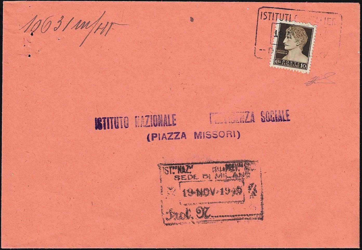 RECAPITO AUTORIZZATO 1945 - 10 cent. Imperiale senza fasci e senza filigrana (536), perfetto, usato come recapito autorizzato su busta da Milano 19/11/1945 per città. Raro ed interessante uso. Ferrario.