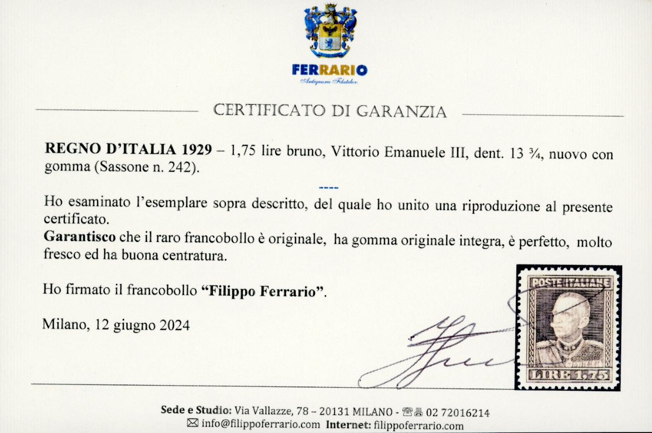 1929 - 1,75 lire bruno Vittorio Emanuele III, dent. 13 3/4 (242), nuovo, buona centratura, gomma originale integra, perfetto e molto fresco. Raro e di ottima qualità. A.Diena, cert. Ferrario.