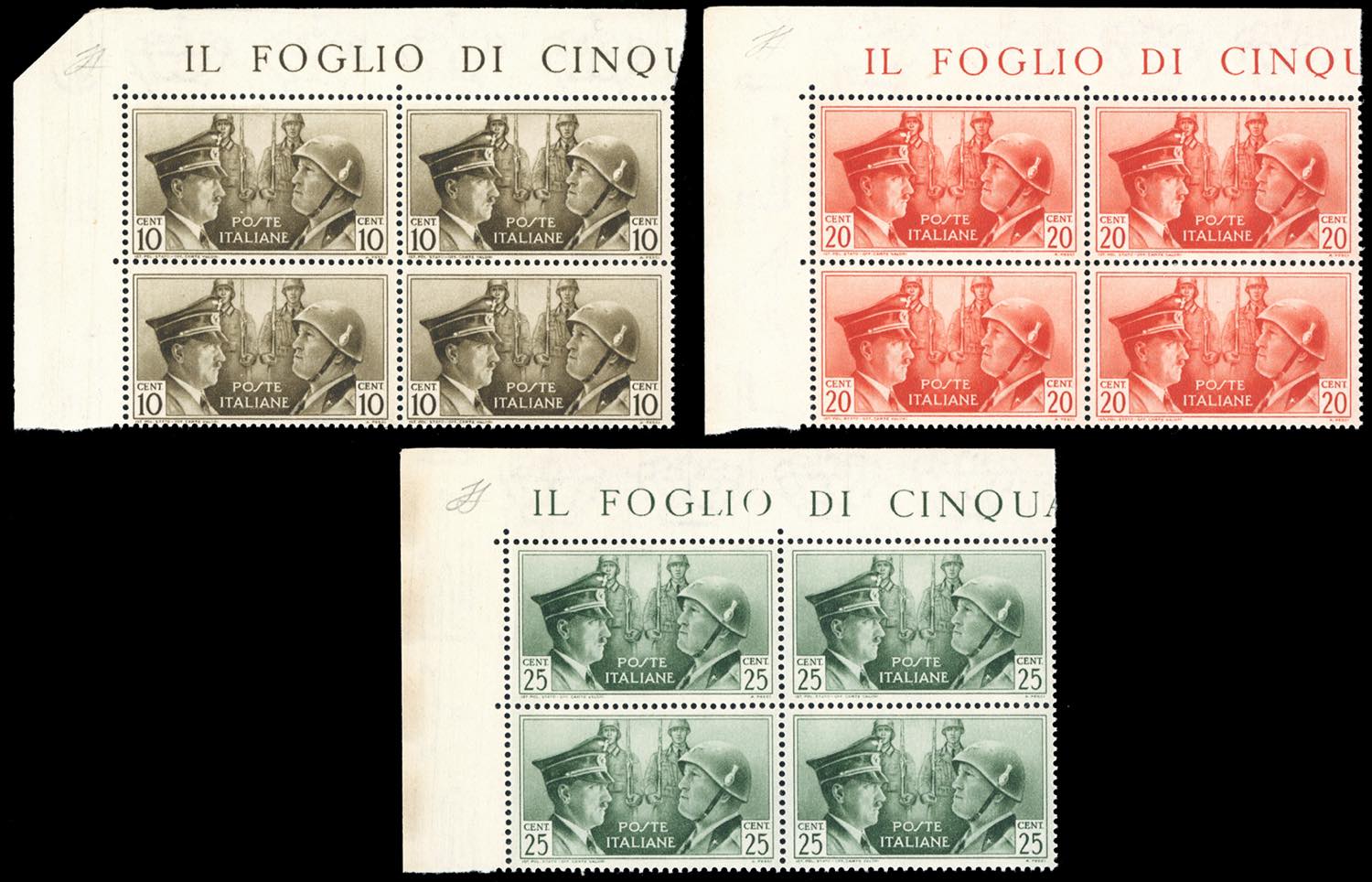 1941 - Fratellanza d'armi, non emessi, serie completa (457A/457C), blocchi di quattro, angolo di foglio, gomma originale integra, perfetti e molto freschi. Ferrario.