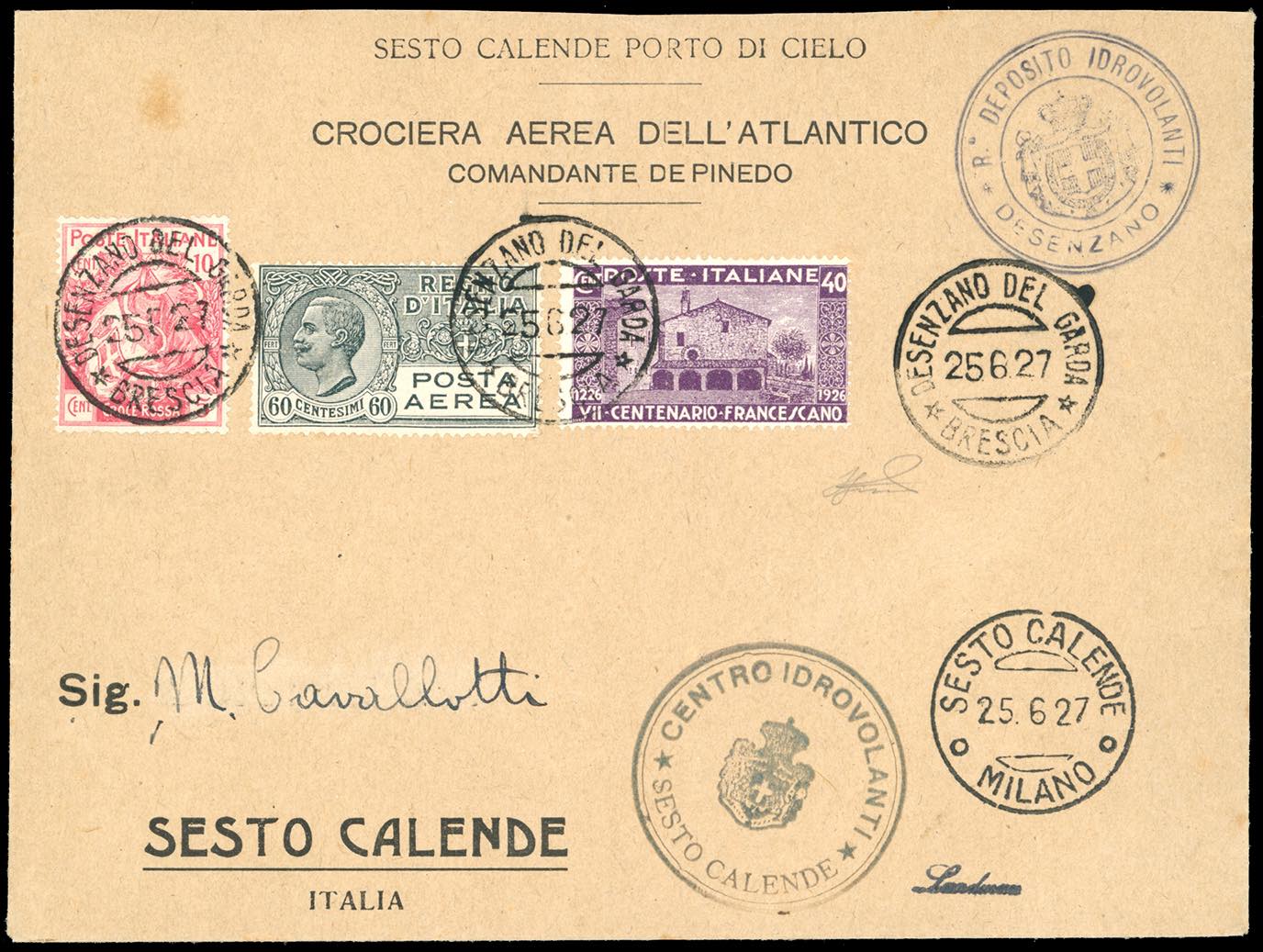1927 - Aerogramma affrancato trasportato con il Raid delle Due Americhe del Comandante De Pinedo, da Desenzano del Garda 25/6/1927 a Sesto Calende. Raro. Ferrario.