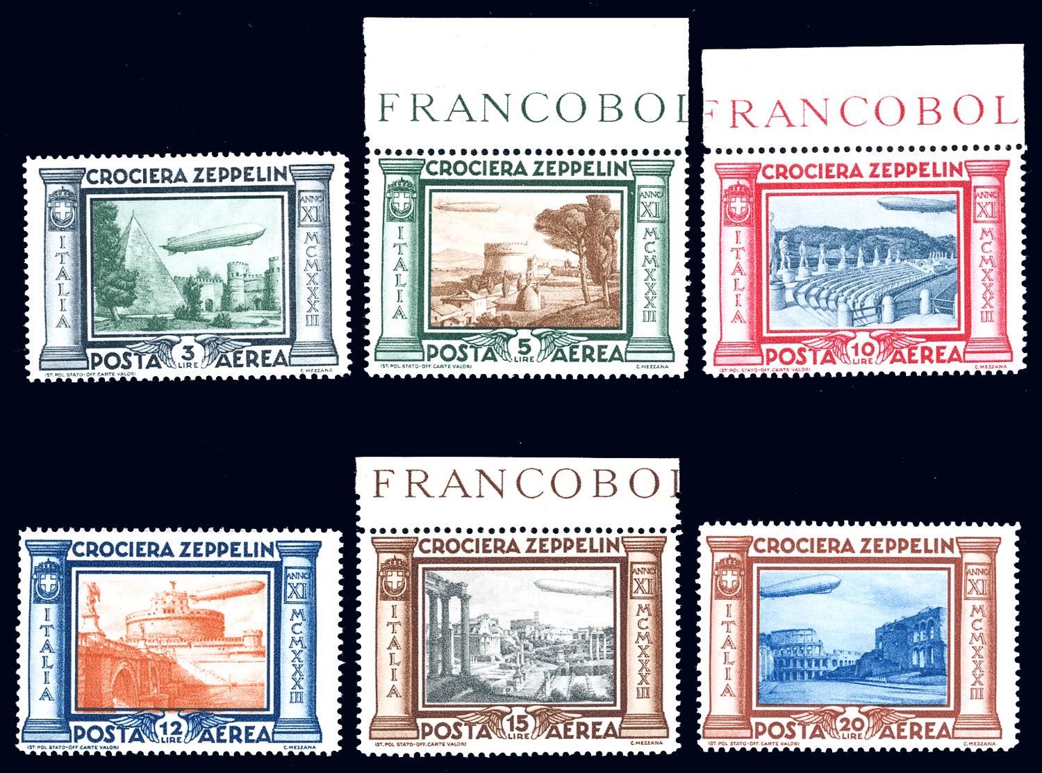 1933 - Zeppelin, serie completa (45/50), gomma originale integra, perfetti e di ottima qualità.