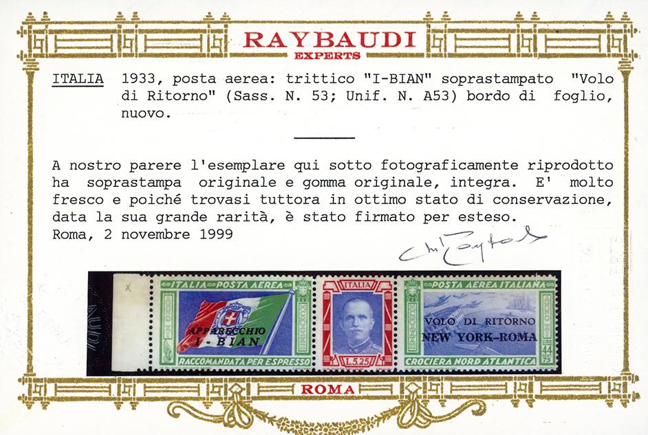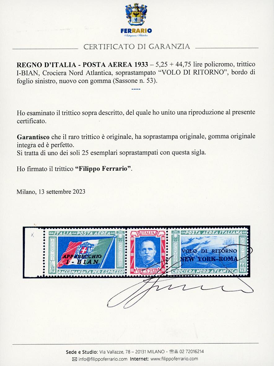 1933 - 5,25 + 44,75 lire trittico I-BIAN, soprastampato "VOLO DI RITORNO" (53), bordo di foglio, gomma originale integra, perfetto. Uno di soli 25 esemplari soprastampati con questa sigla. Rarità del Regno d'Italia, ottima qualità. Giulio Bolaffi per esteso, cert. Oro Raybaudi e Ferrario.
