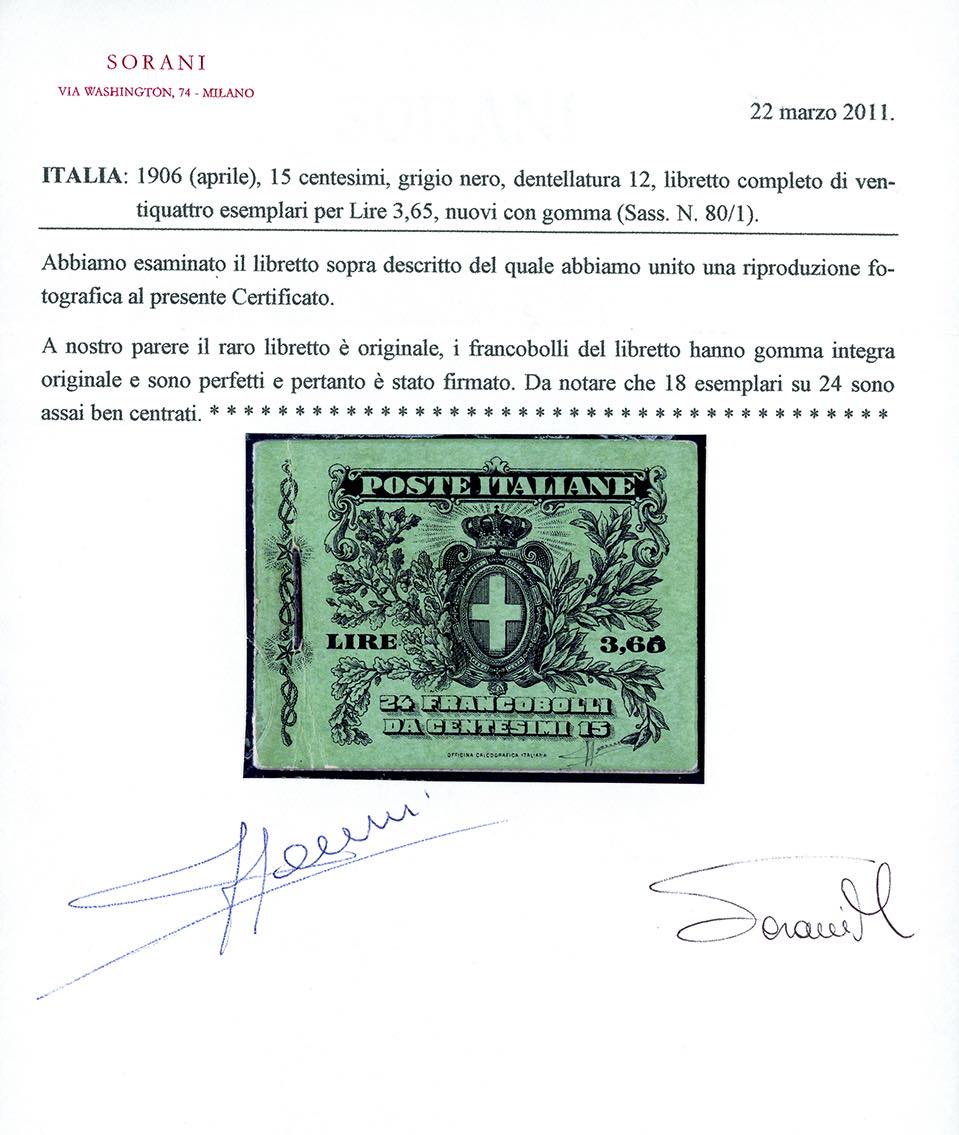 1906 - 15 cent. Michetti, dent. 12, libretto completo di 24 esemplari (1), gomma originale integra, perfetto e di ottima qualità. Splendido e molto raro, pochissimi libretti completi noti. Zanaria, cert. Sorani.
