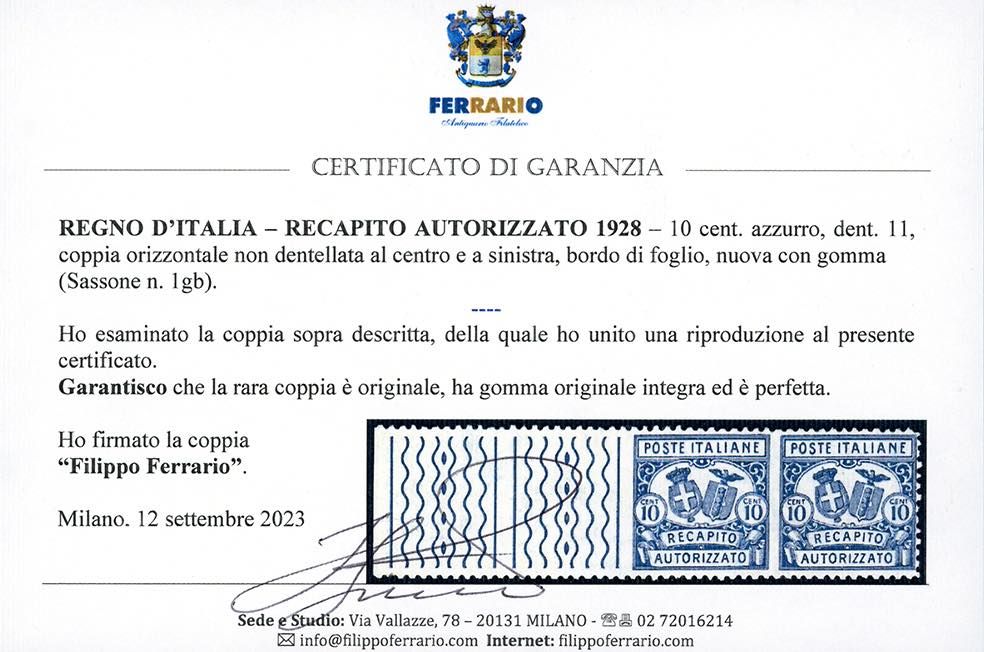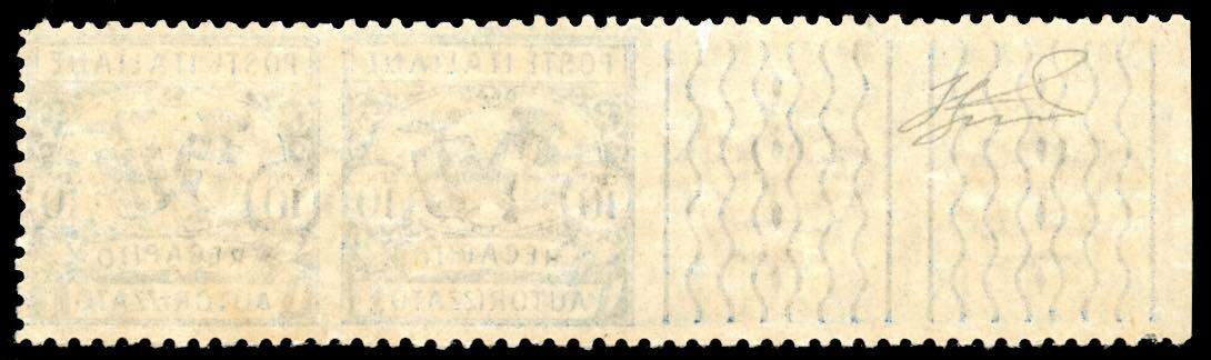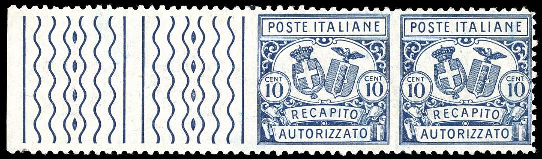 1928 - 10 cent. dent. 11, coppia orizzontale non dentellata al centro e a sinistra (1gb), bordo di foglio, gomma originale integra, perfetta. Molto rara. Cert. Ferrario.