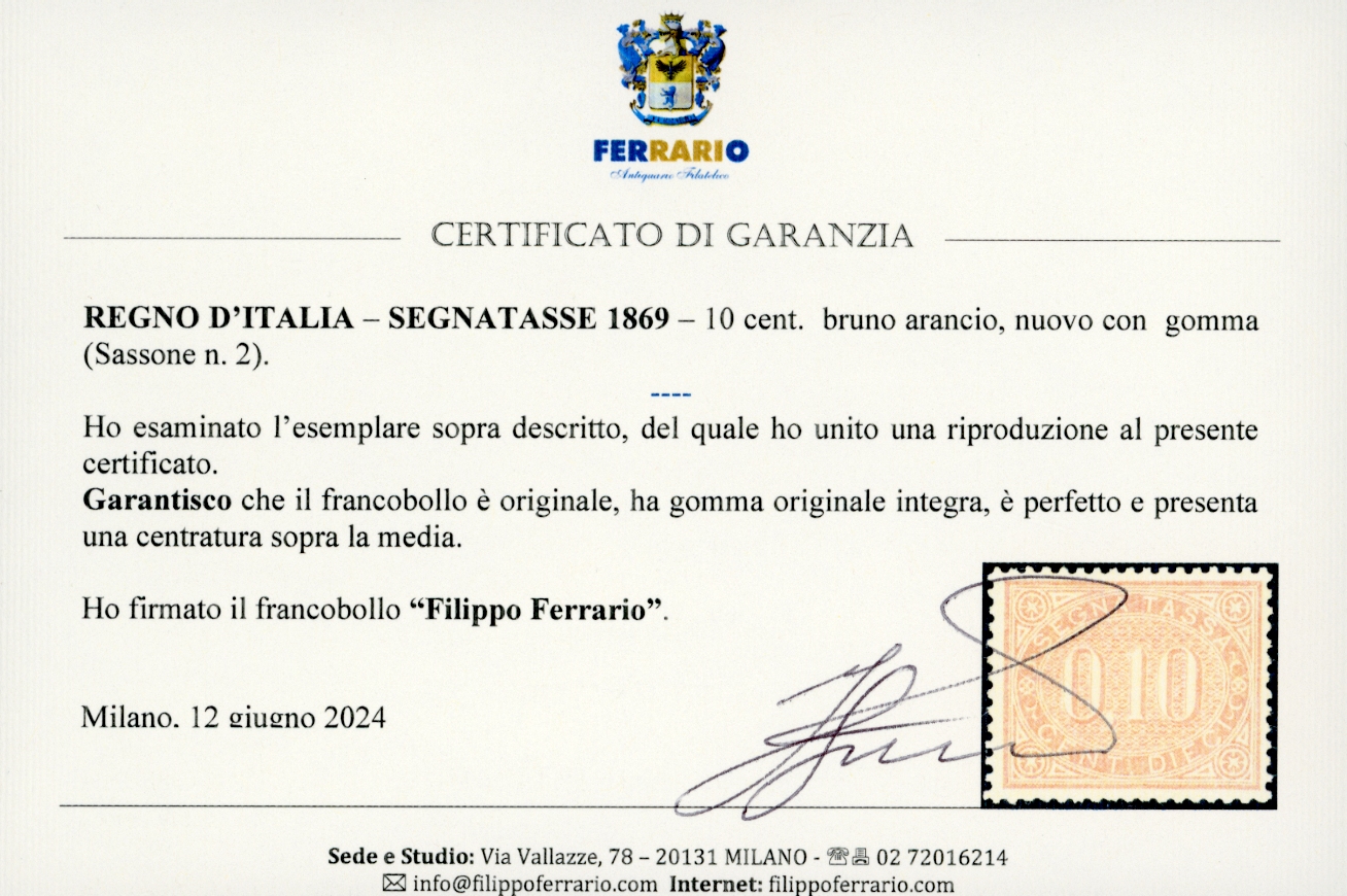 1869 - 10 cent. bruno arancio (2), nuovo, gomma originale integra, perfetto. Molto fresco, buona centratura. Raro di questa qualità. Fiecchi, Diena, cert. Ferrario e Oro Raybaudi.