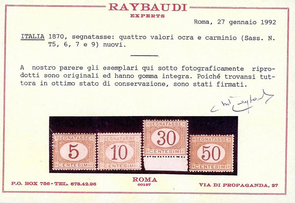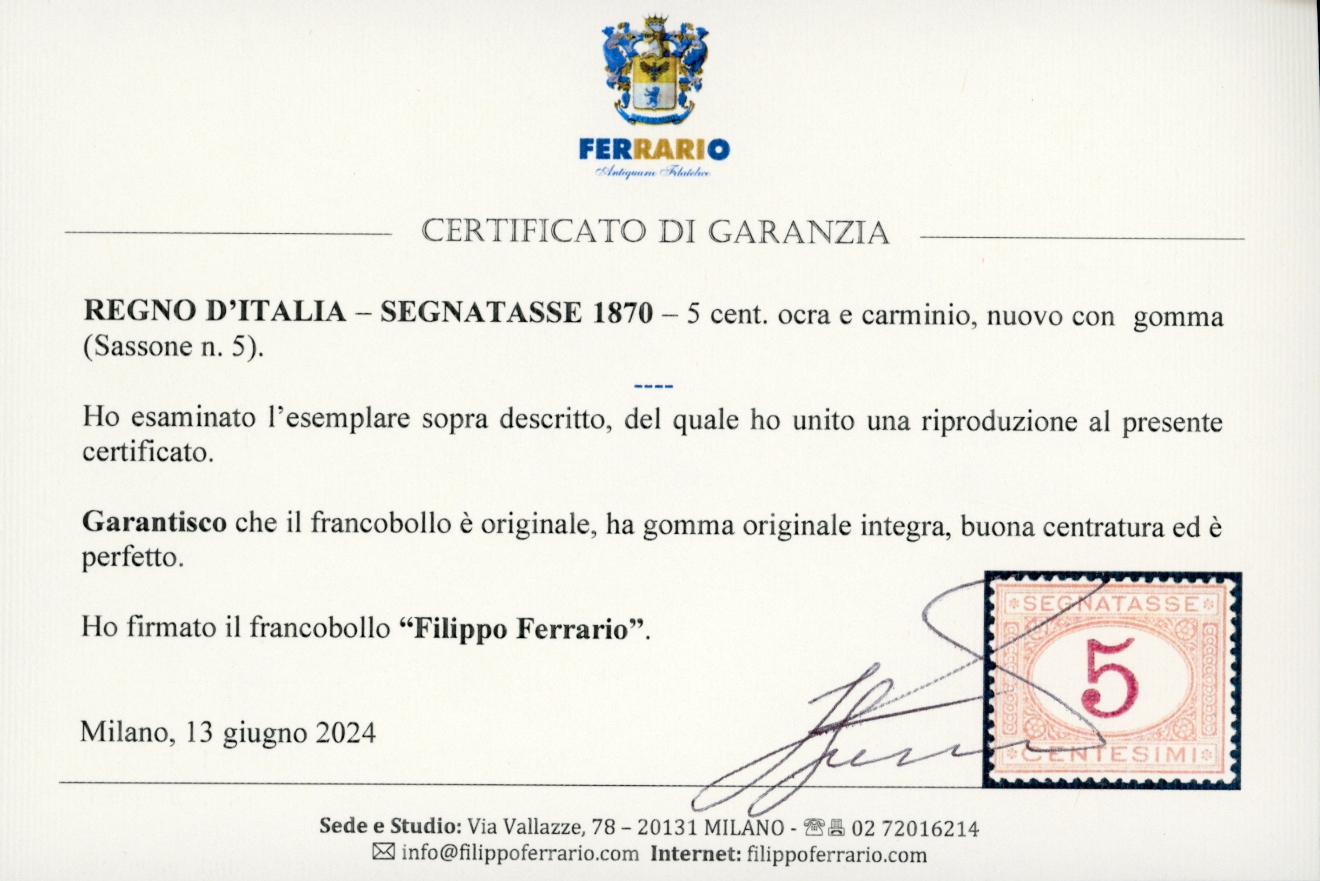 1870 - 5 cent. ocra e carminio (5), gomma originale integra, perfetto. Molto bello. Cert. Ferrario e fotocopia cert. Raybaudi.