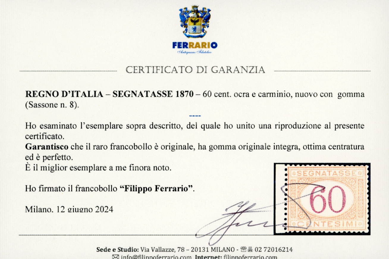1870 - 60 cent. ocra e arancio (10), ottima centratura, bordo di foglio, gomma originale integra, perfetto e di grande freschezza. Raro e splendido, qualità eccezionale. Uno dei migliori esemplari esistenti. Cert. Oro Raybaudi e Ferrario.