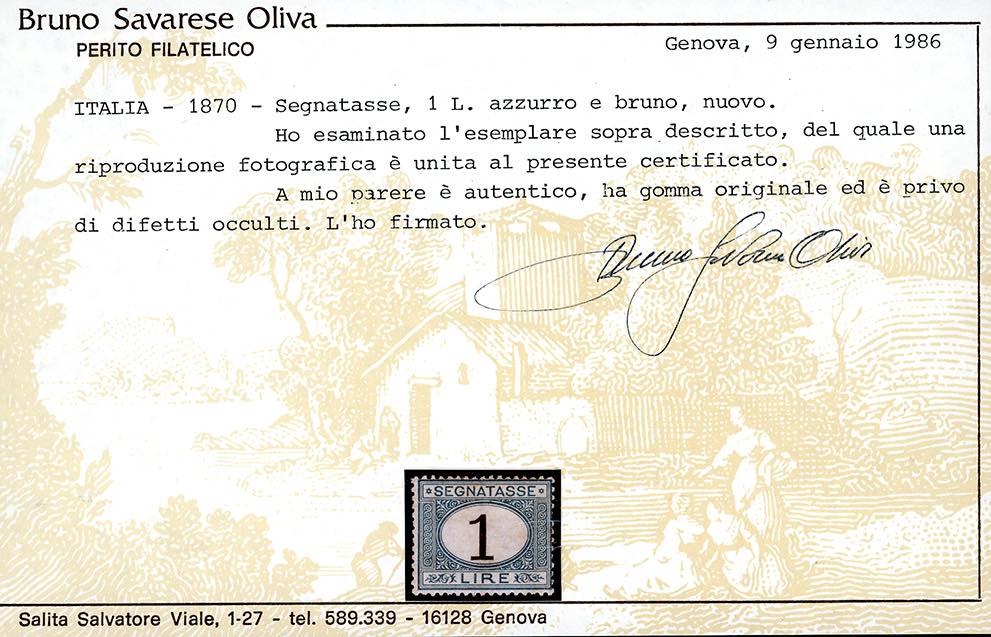 1870 - 1 lira azzurro chiaro e bruno (11), buona centratura, gomma originale, leggera traccia di linguella, perfetto. Raro. A.Diena, Fiecchi, cert. Oliva e Ferrario.