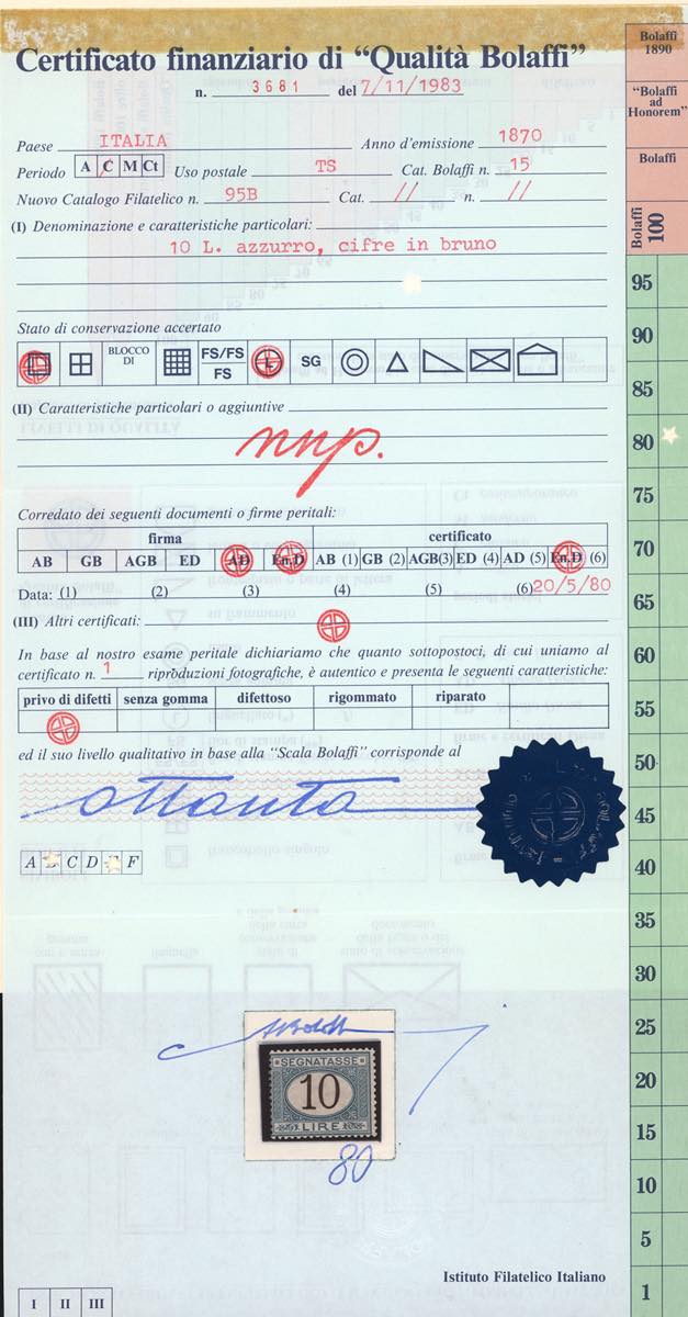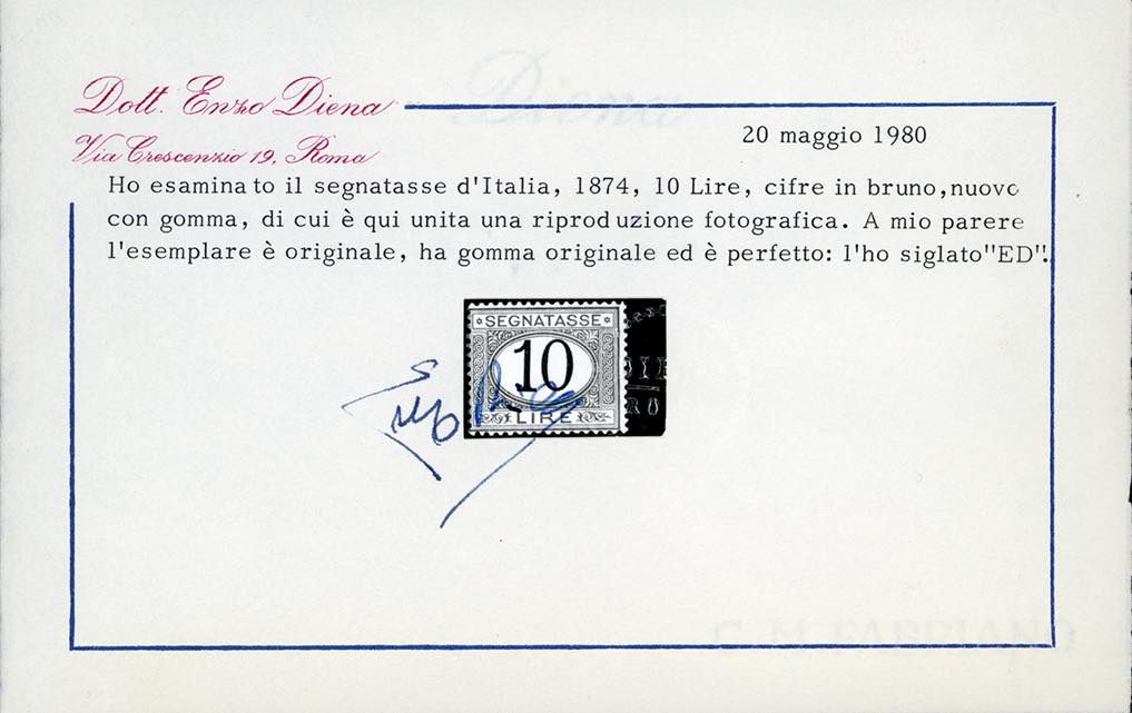 1874 - 10 lire azzurro e bruno (14), gomma originale, impercettibile traccia di linguella, perfetto e molto fresco. Raro. G.Oliva, Raybaudi, cert. Finanziario Bolaffi 80% ed E.Diena.