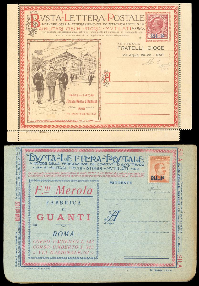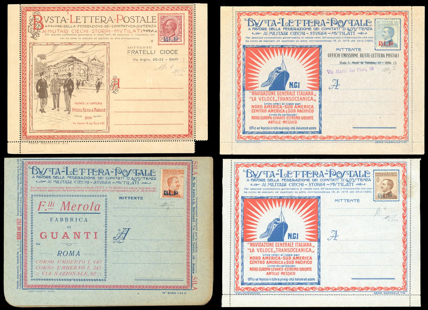 1921 - Soprastampati BLP del I tipo, serie completa (1/4), nuovi, su buste speciali. Ottima qualità e non comuni. Ferrario/A.Diena.