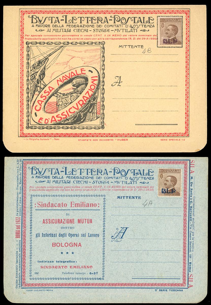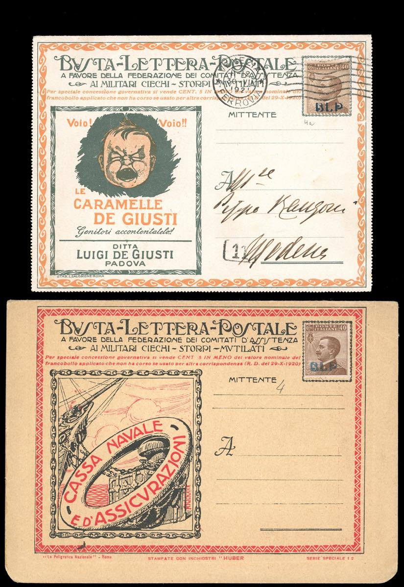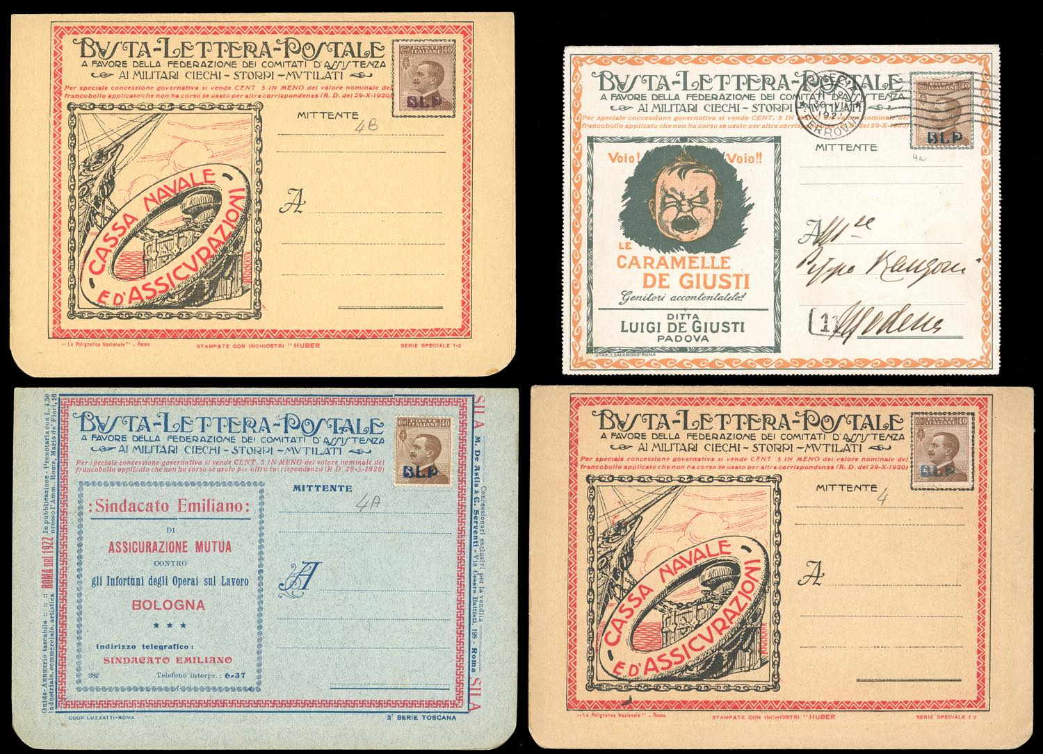 1921 - 40 cent. soprastampa BLP del I tipo, quattro esemplari di colori diversi (4,4A,4B), tre su buste speciali nuove ed uno (4A), su cartolina viaggiata. Ottima qualità.